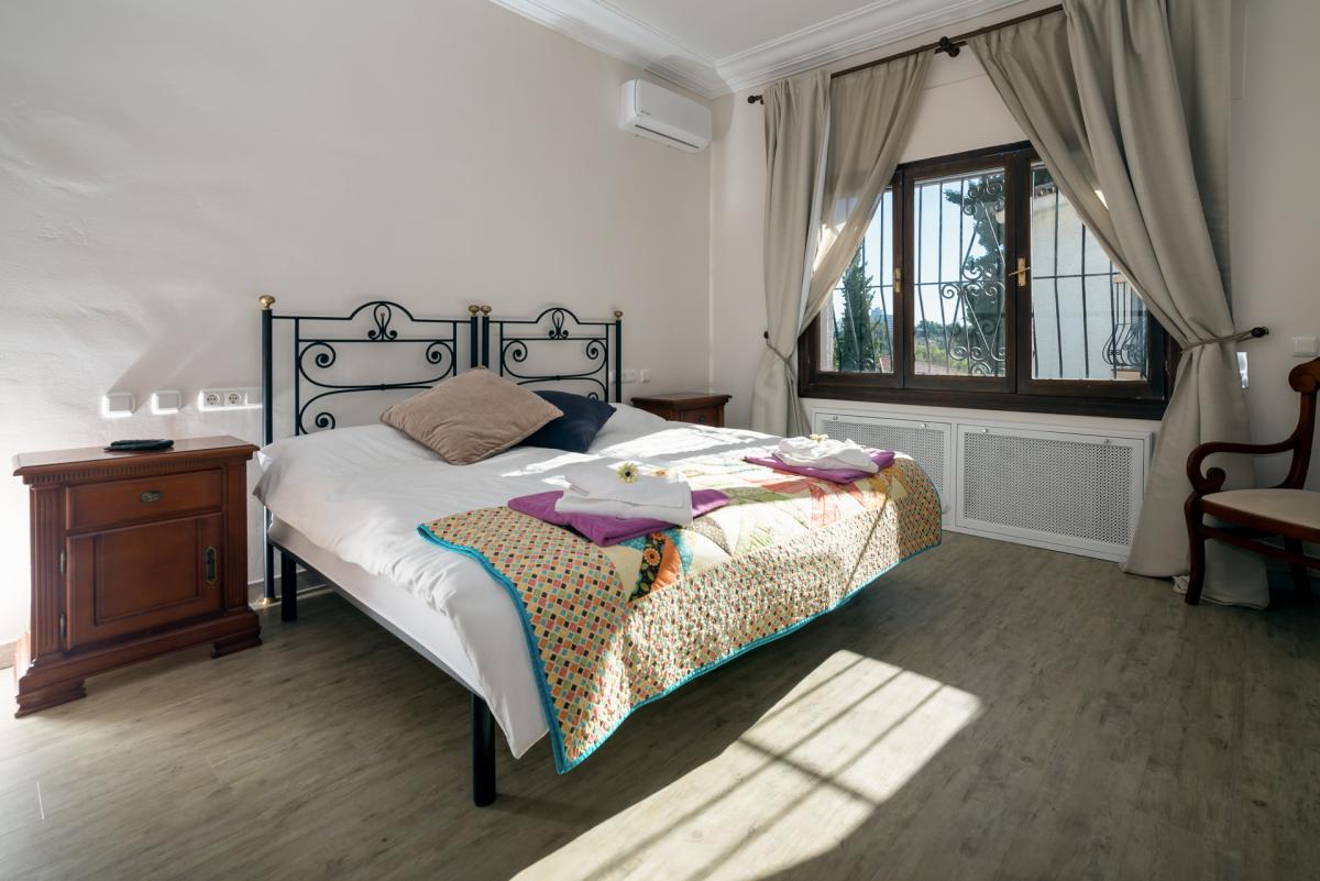 BEDROOM 3: Double bed. Access to shared patio. Pool, terrace and sea views. En-suite bathroom with tub, shower and bidet.
