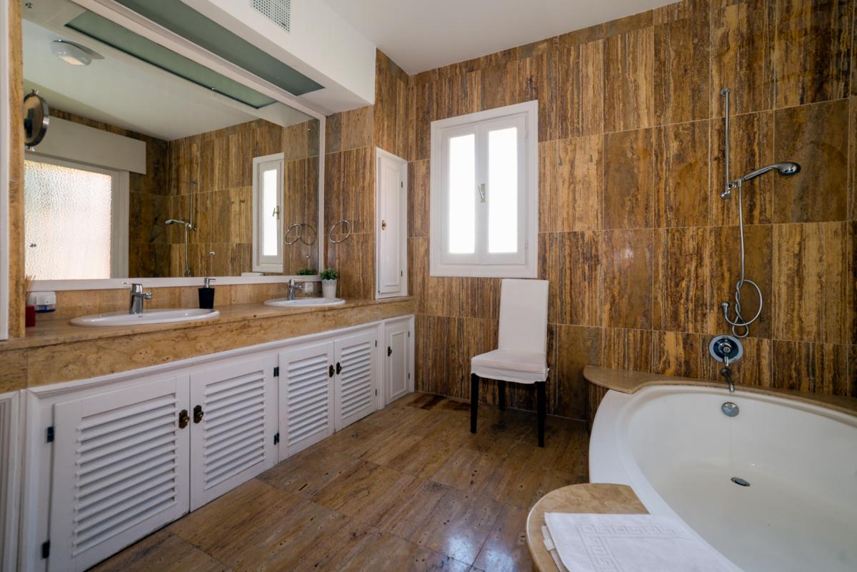 MASTER SUITE 1: King-size bed, Twin bed plus sofa bed which can sleep two. Fireplace. Access to a shared patio with sea, garden and golf course views. En-suite bathroom with his ‘n hers WCs, tub, shower and bidet. Bathroom has access to shared patio.