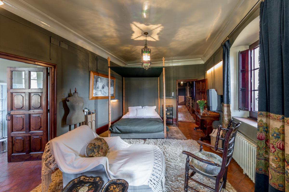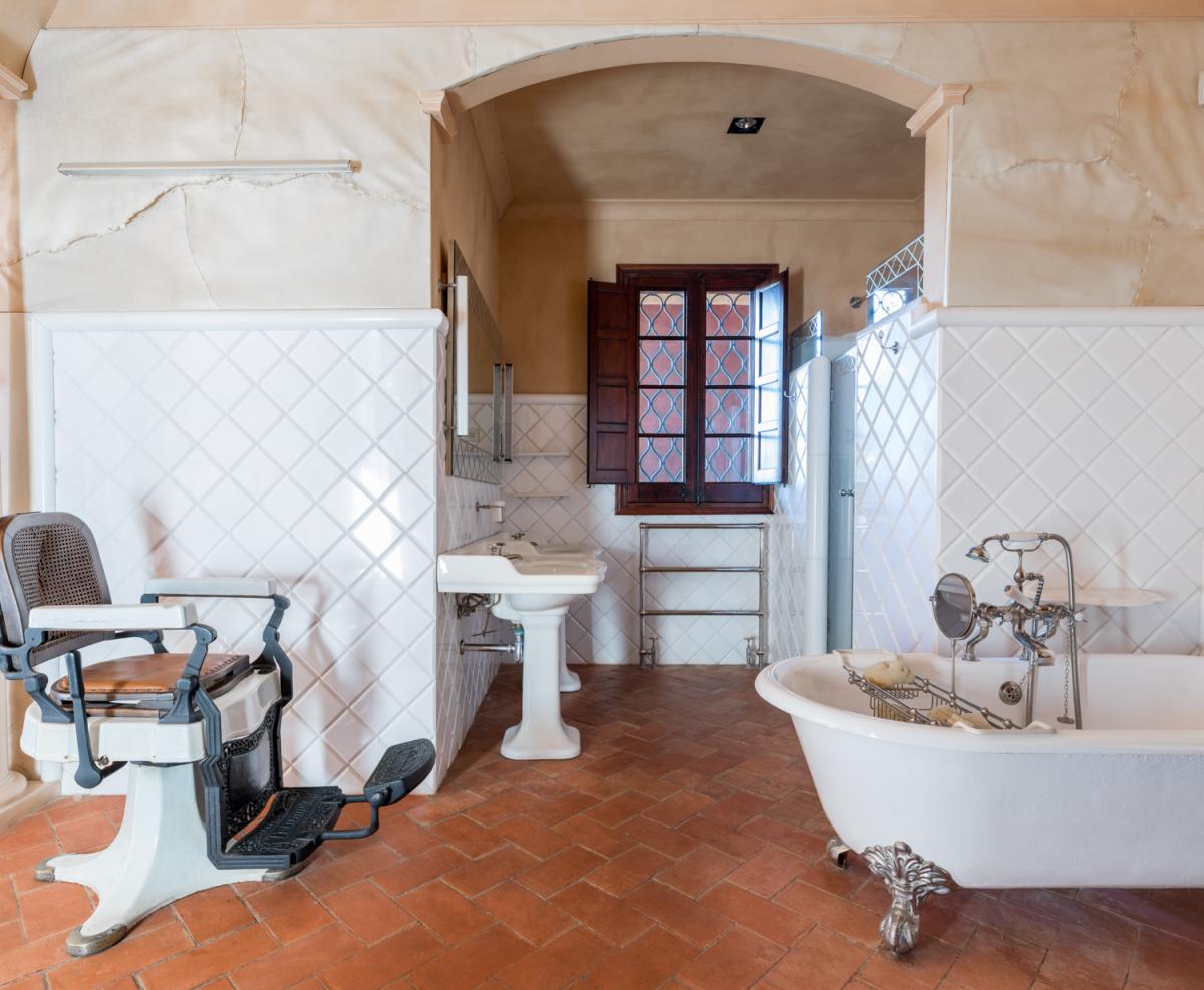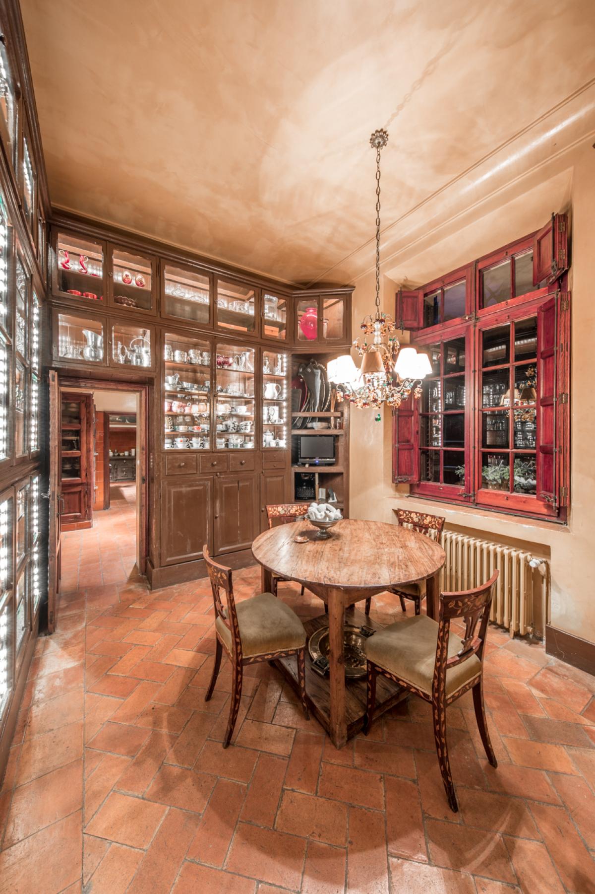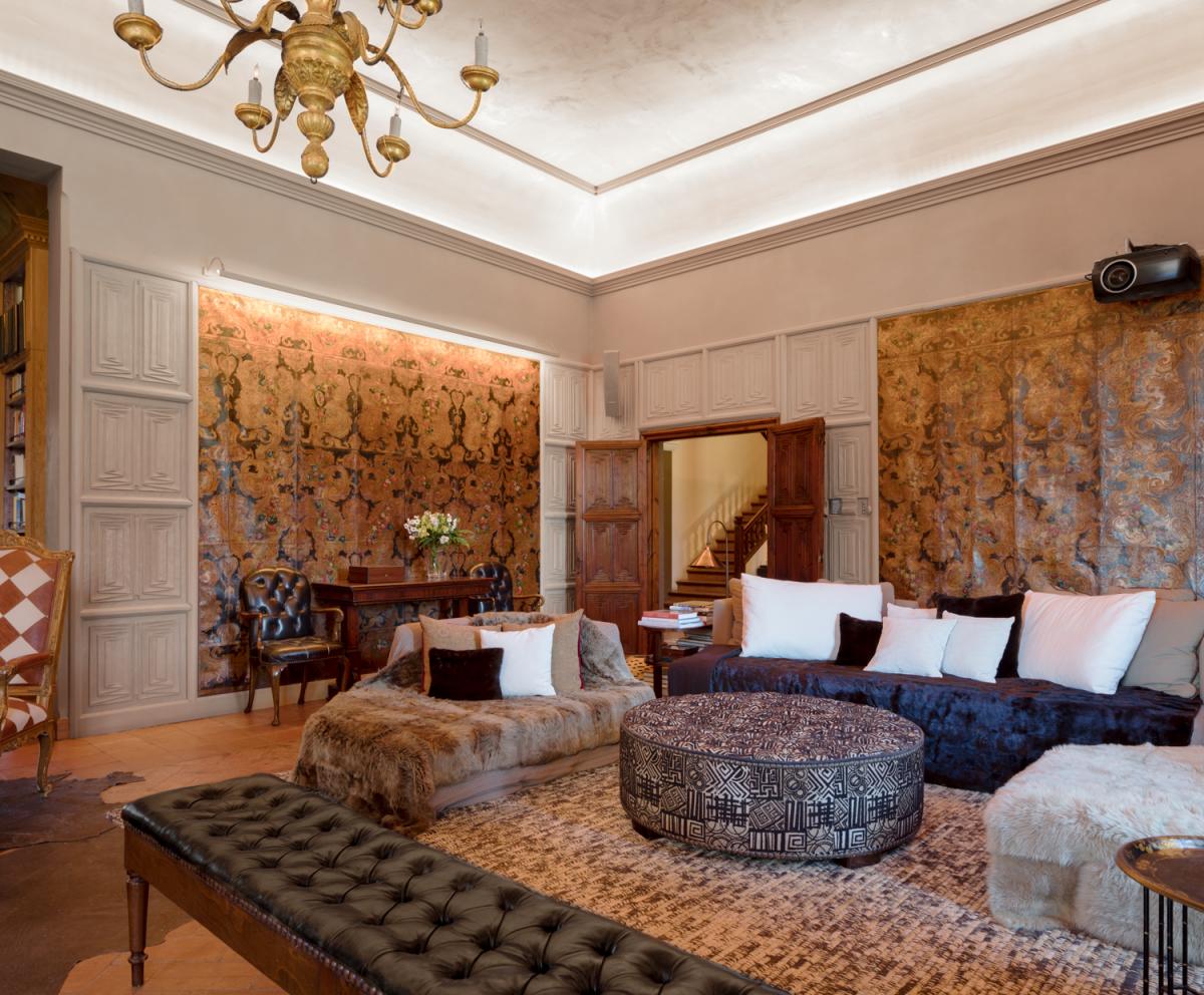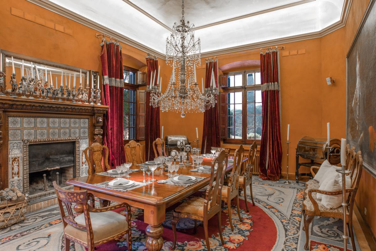 Upon approaching Mas de Castell off the drive, guests are greeted by the courtyard lined with lush greenery. Entering into the home, the foyer with grand piano, beautiful sofa and armchairs opens onto the large salon with fireplace and sitting area, projector and screen, as well as the office and dining room. Upholstery from different historical periods, including tanned leather and silk blends adorn the living room governed by a huge fireplace, where guests can enjoy home cinema, music or the in home. Completing this level of the home are service quarters, a full kitchen utilized by the house staff for guests’ dining pleasure, as well as a large dining room with seating for up to 18 guests as well as art and historic furniture for guests’ viewing pleasure.