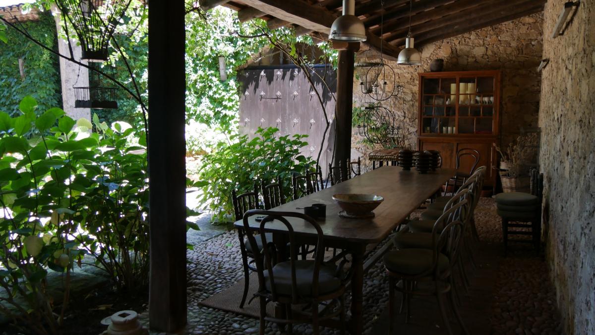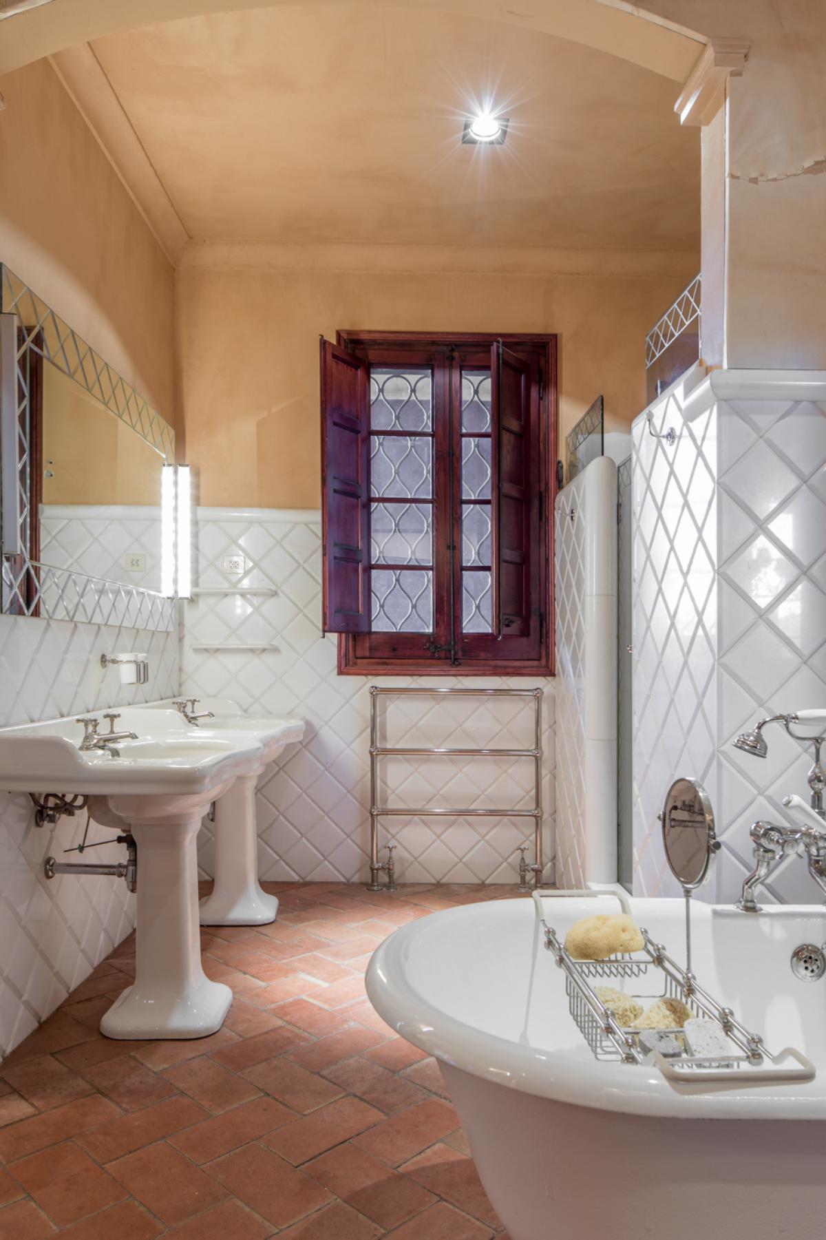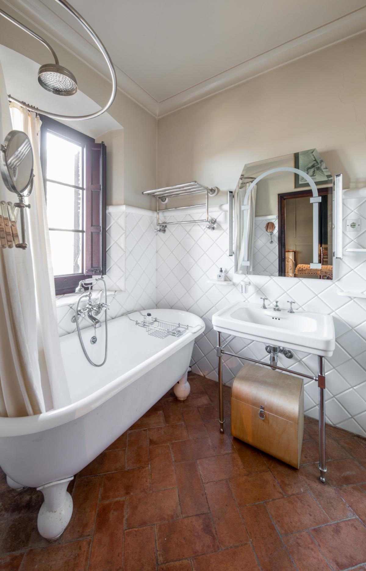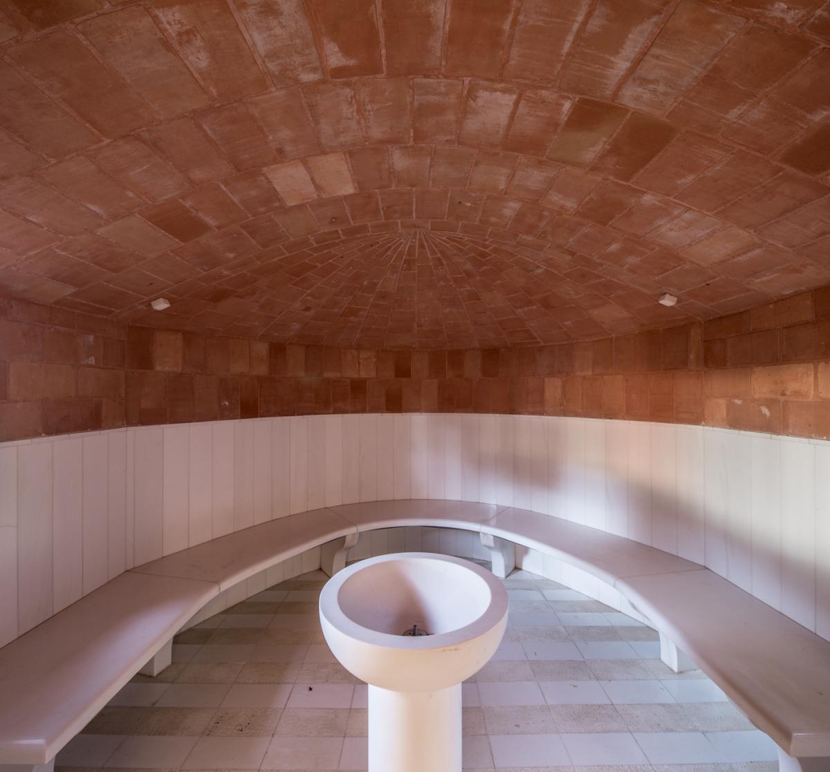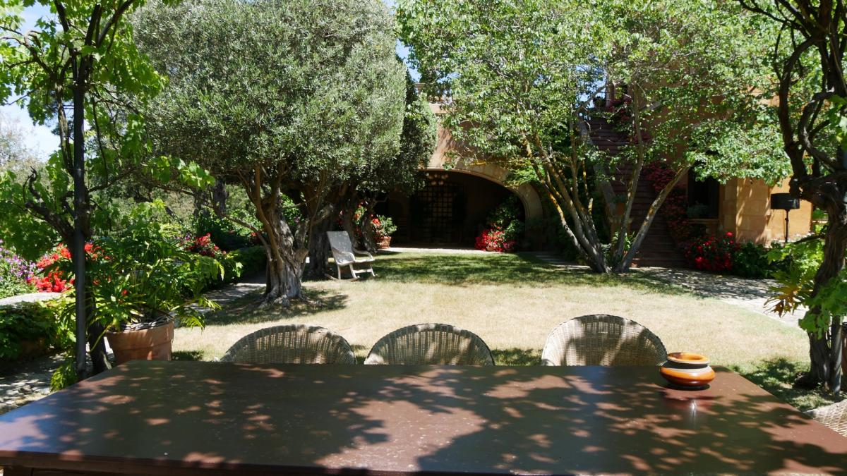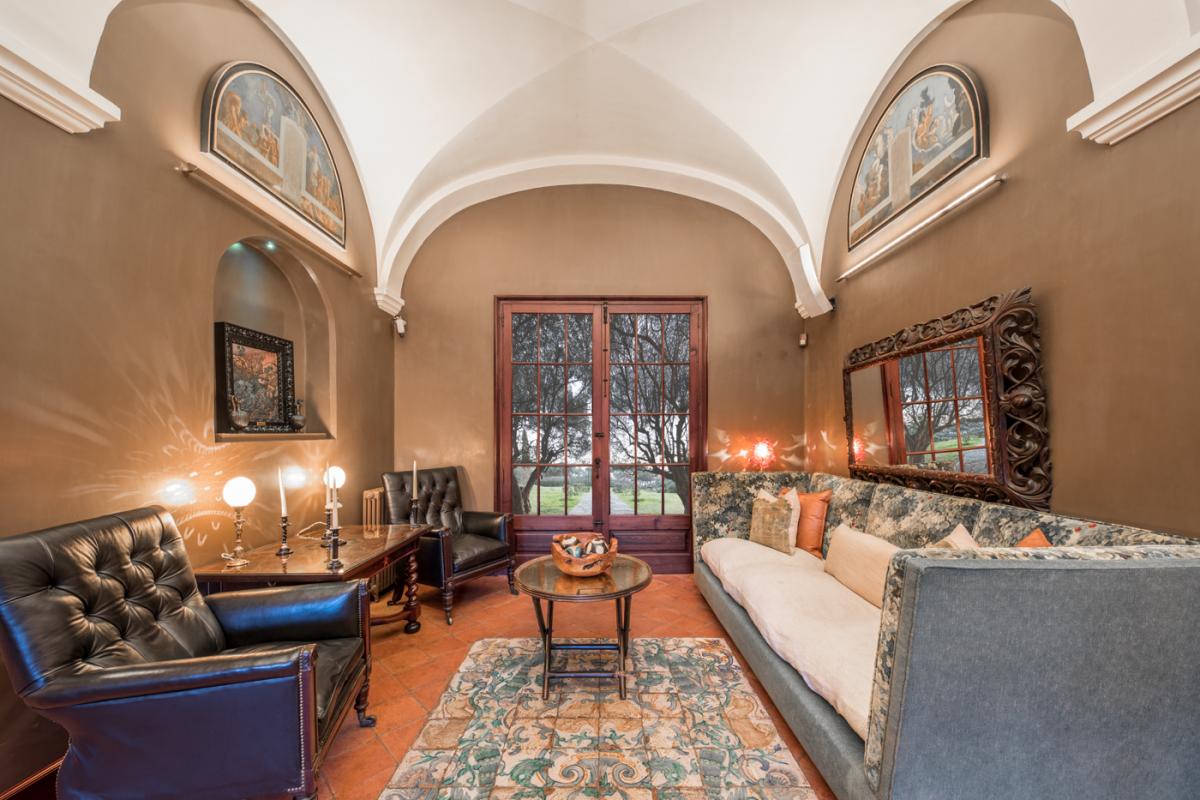 Upon approaching Mas de Castell off the drive, guests are greeted by the courtyard lined with lush greenery. Entering into the home, the foyer with grand piano, beautiful sofa and armchairs opens onto the large salon with fireplace and sitting area, projector and screen, as well as the office and dining room. Upholstery from different historical periods, including tanned leather and silk blends adorn the living room governed by a huge fireplace, where guests can enjoy home cinema, music or the in home. Completing this level of the home are service quarters, a full kitchen utilized by the house staff for guests’ dining pleasure, as well as a large dining room with seating for up to 18 guests as well as art and historic furniture for guests’ viewing pleasure.