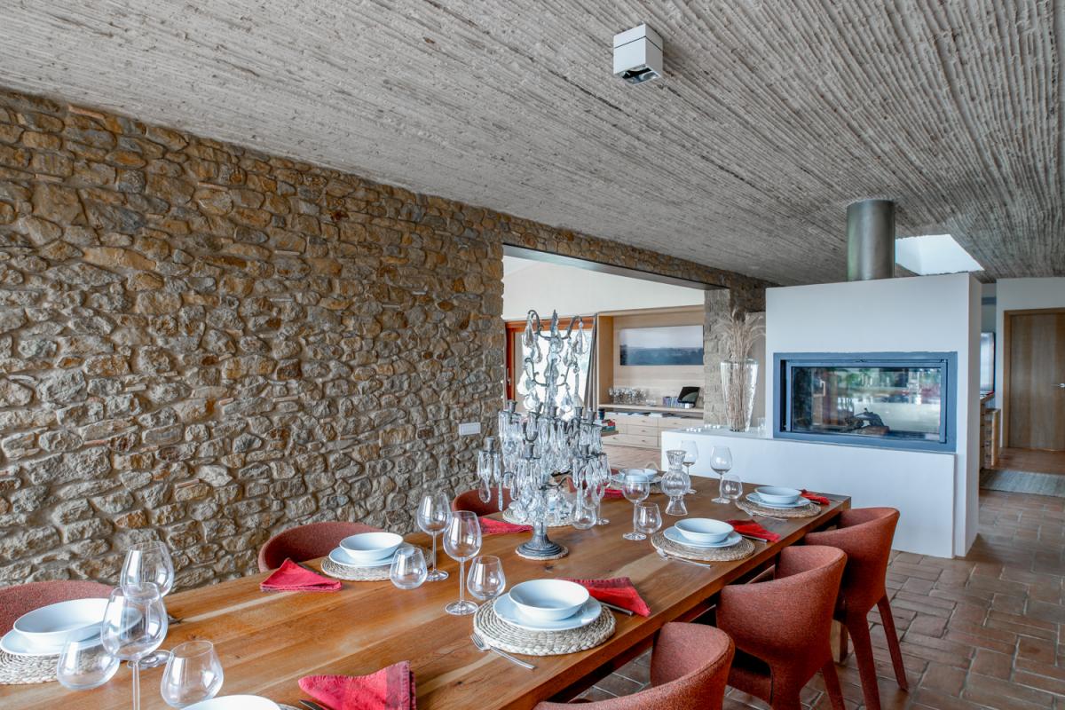 An open concept great room allows for the same jaw dropping views to be visible throughout the main living area. Mini vaulted ceilings with Spanish tile floors create a perfect setting from which to enjoy time spent with family. Two deep, comfortable sofas and an armchair encircle the room, allowing guests to sit back and bask in the breathtaking views of the Spanish countryside. Adjacent to the living room is the dining room with an original stone wall, textured ceiling and sleek, wooden table with seating for up to eight guests in round back chairs. Serving the dining room, and sitting opposite the dual sided fireplace, is the home’s enviable kitchen. This gourmet space invites for group meal creation with a large stainless steel island, breakfast bar with seating for four, abundant counterspace and state of the art appliances.