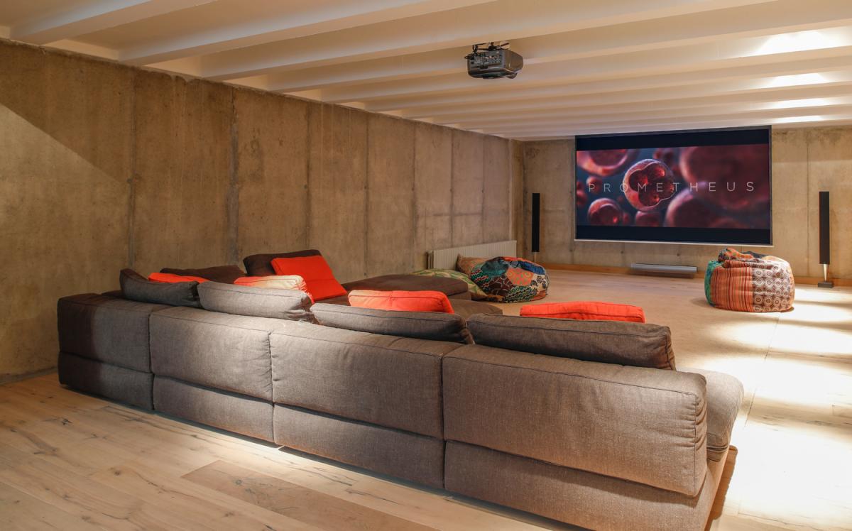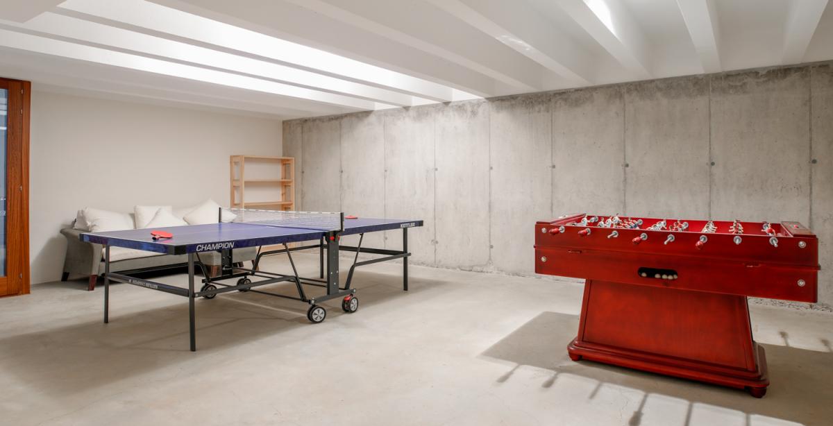 A plethora of entertainment options occupy the estate’s lowest level. A large in home cinema plays host to an oversized, deep sectional sofa with projector, screen and a full library of movies to enjoy. The neighboring lounge area offers a full size foosball table, as well as ping pong and two sofas for spectators. Looking to make some music? Look no further than the home’s soundproof music room with full size piano, drum set and guitar! For those who aren’t able to escape work, a quiet escape also awaits on the bottom floor.