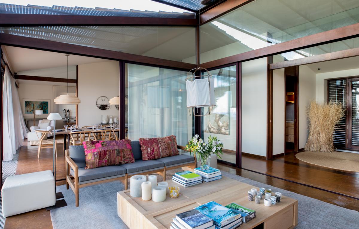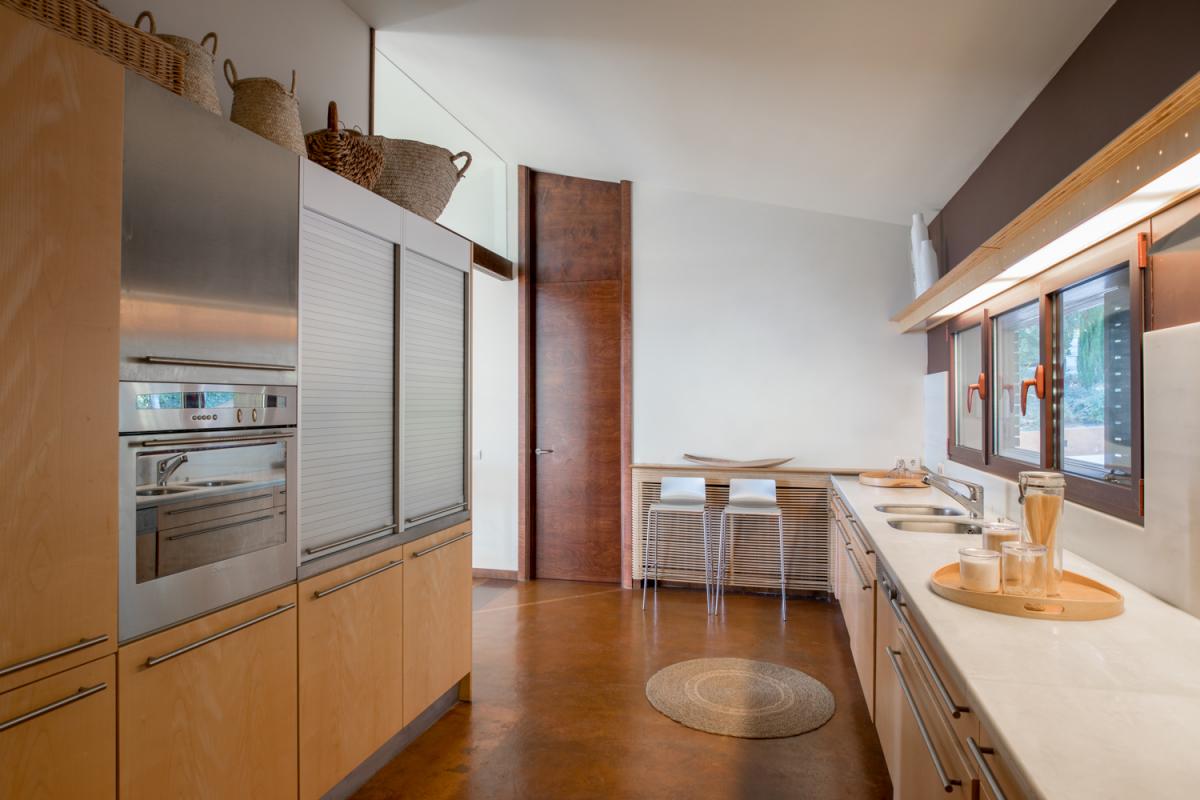 Upon entering into the home, a striking view of la Punta des Mut greets guests through the floor to vaulted ceiling windows of the living area. Flooded with light, the living room is perfectly symmetrical in its design with concrete floors and mirrored couches. Sitting adjacent to this space is a glass enclosed den with flat screen TV and wood burning fireplace, inviting guests to sink into an amazing book on the chaise, facing the endless blue sea horizon. Opposite this room, the dining room with seating for up to eight is served by the connected kitchen with stainless steel appliances, ample counter space and staff quarters for two maids.