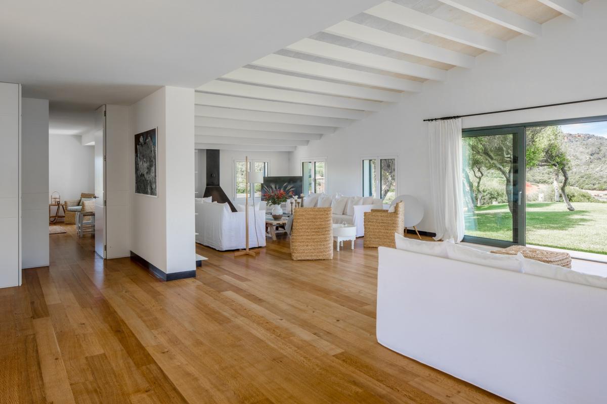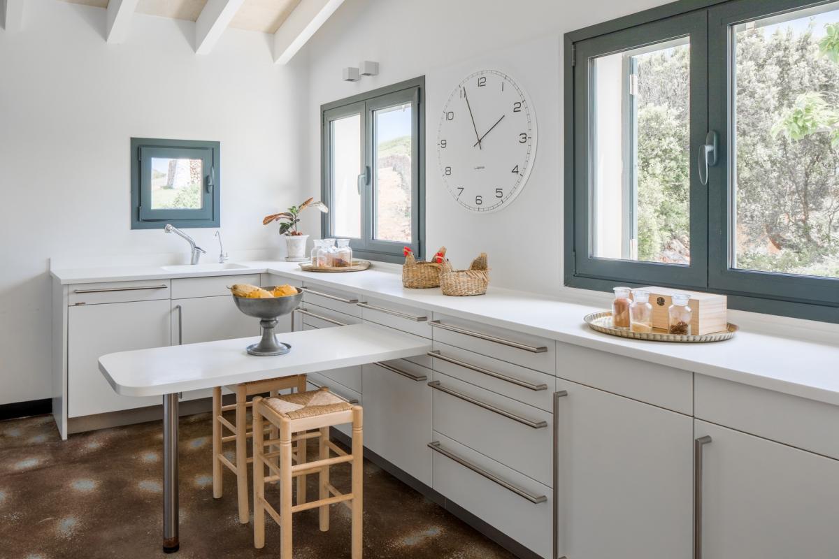 Pristinely white inside and out, with large glass windows and green shutters, this home is the definition of Minorcan design and elegance. Enter into the bright and open living space, with bleached wood detailed vaulted ceilings, large sliding glass doors offering unobstructed views of the infinite grounds, hard wood flooring, and a mix of white cotton and whicker seating. Two sitting areas are created, one centering around a large iron fireplace and flat screen tv, while the other emphasizes the outdoors, sitting just inside the floor to ceiling sliding glass doorway. Continuing past the living space, is a playful casual dining area with mismatched seating for eight and a upright piano, perfect for a night of entertaining. Around the corner is the formal dinning room for 10 surrounded by paired sliding glass doors taking up two entire walls, allowing guests to drink in the stars along with the conversation. The neighboring kitchen is perfectly designed to serve these spaces with ample counter space and high end appliances.