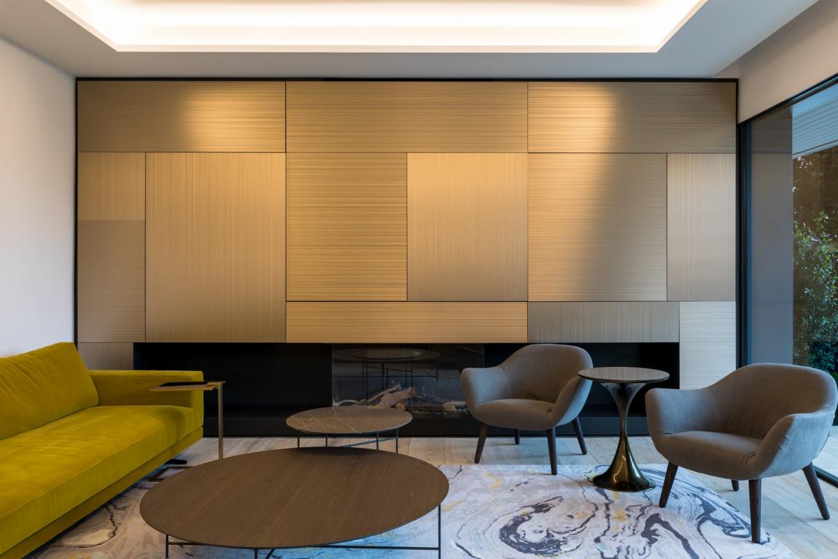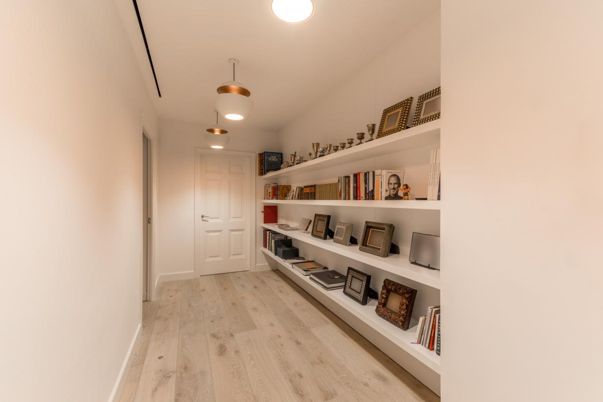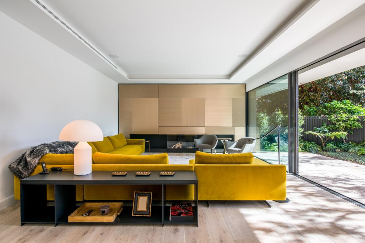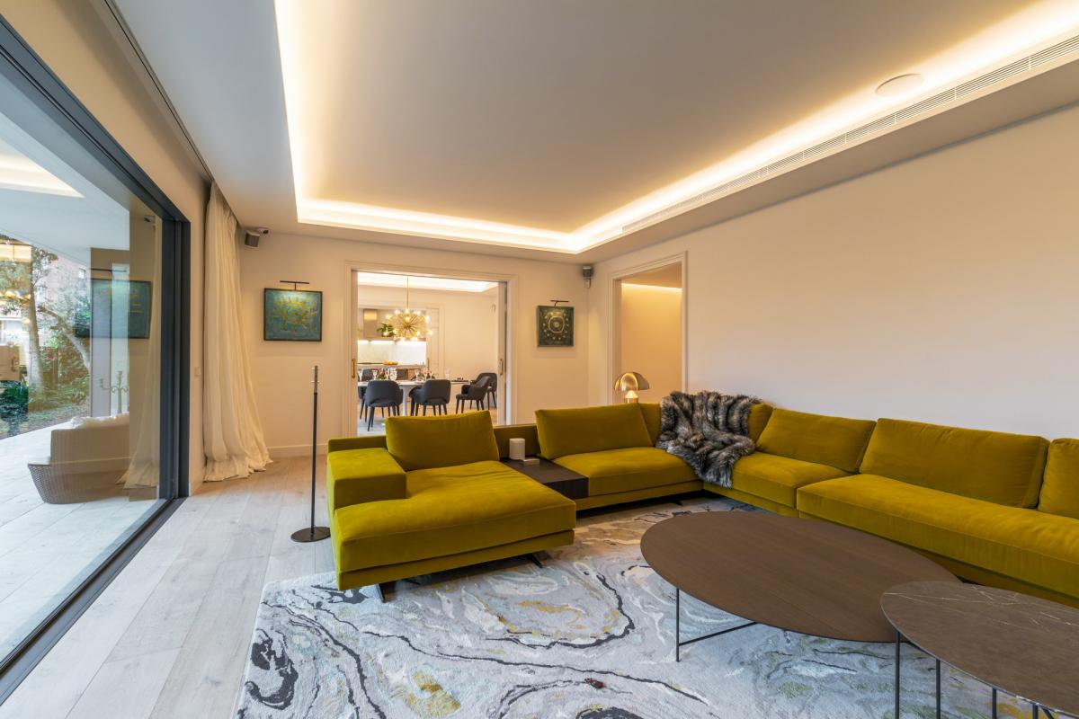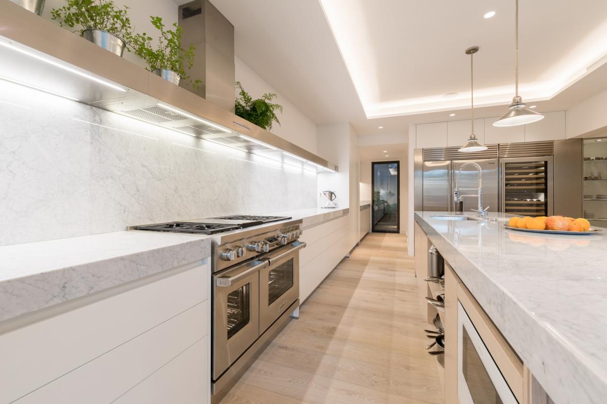 Guests enter through the front door with a 24/7 doorman into a pristine white foyer complete with modern art and a marble foyer table. The blonde hardwoods carry guests into the expansive great room, complete with large, bright sectional couch, two arm chairs, flat screen TV and gas fireplace along with amazing views of the garden through the floor to ceiling glass sliding door, which takes up the entire fourth wall.
