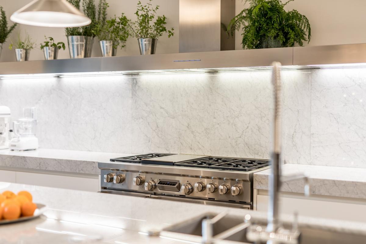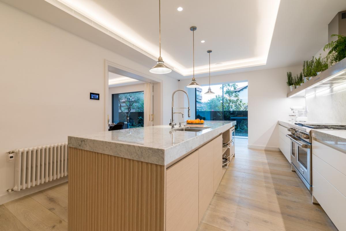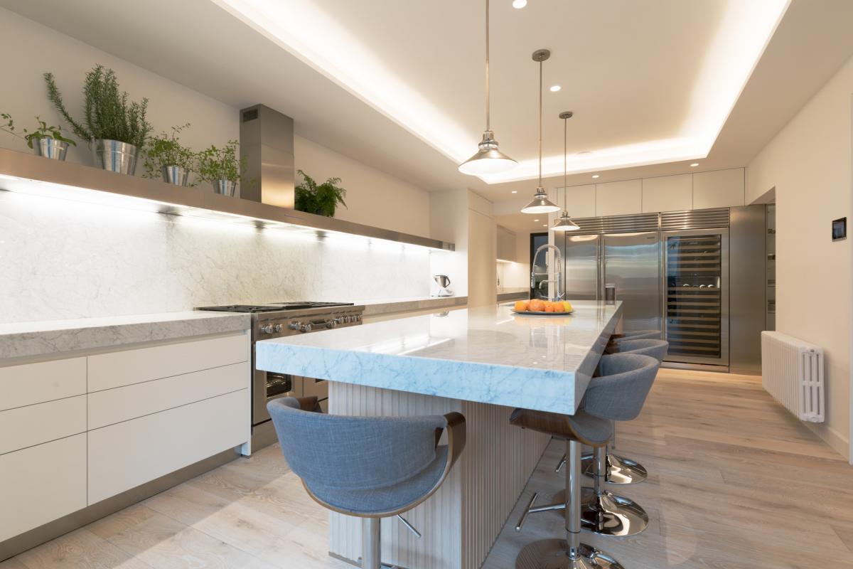 Beside the dining area is a gourmet kitchen with blonde hardwood floors and white custom cabinetry. Complete with six range stainless steel Wolf oven, drip coffee maker, professional refrigerator and full size wine cellar, the space is accented by a large marble island with bar seating for four.