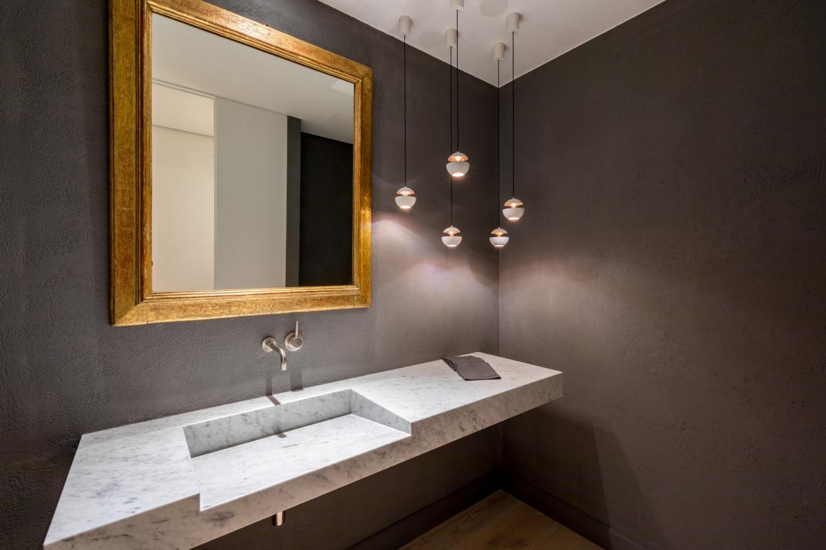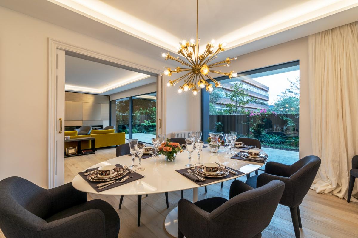 Adjacent to the living area is an elegant white dining room with round table and padded seating for eight. Accenting the space is a gold starburst chandelier, as well as the same glass floor to ceiling door to the outside garden. A powder room is located just off the foyer for guest's conviencence.