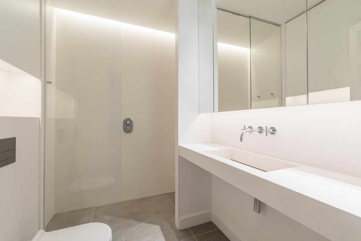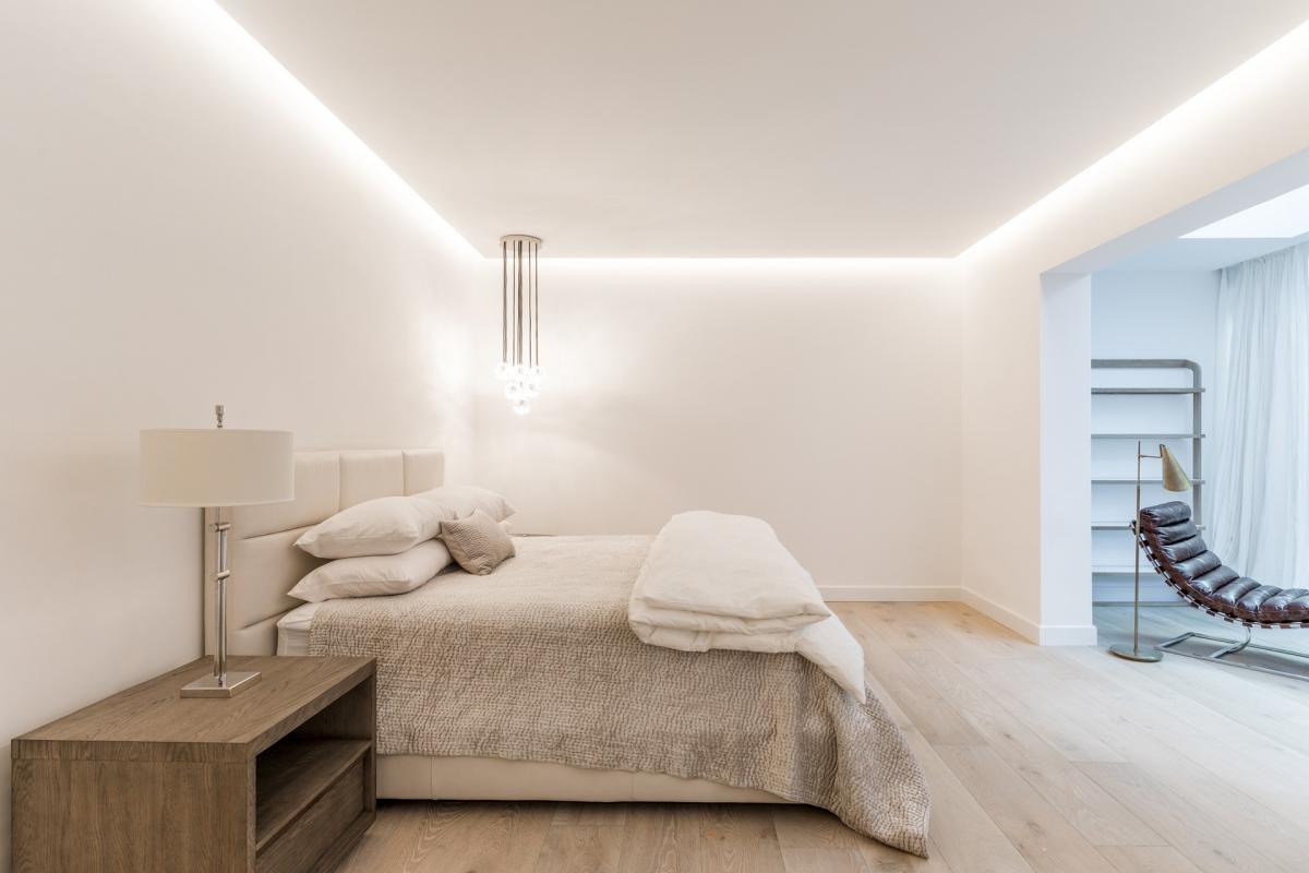 The master king suite sits just off the main entryway and boasts beautiful white furniture including sectional couch and office nook overlooking the garden space. There is also a flat screen tv, leather chaise and exercise bike where guests can work out inspired by gorgeous garden views. An exceptional feature of this room is the open space flowing into the garden and the immaculate en suite bathroom. There is also a large walk in closet complete with custom shelving and floor to ceiling mirror.