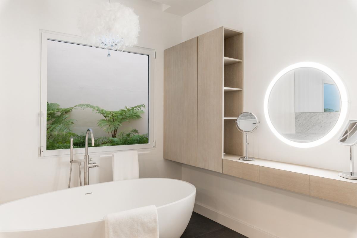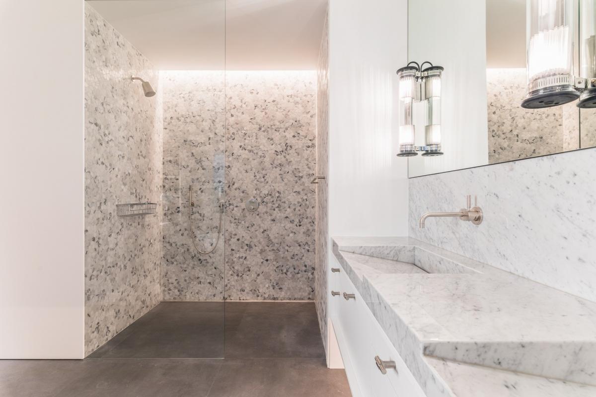 The en suite bathroom has white tile flooring and marble countertops with dual sinks. An impressive soaking tub sits alongside an atrium area complete with ferns. A modern feather and crystal chandelier hovers above the tub adjacent to white custom cabinetry complete with illuminated make up mirror. The bathroom is completed by a huge walk in glass shower with grey and white stone accents.