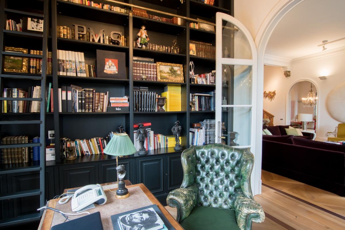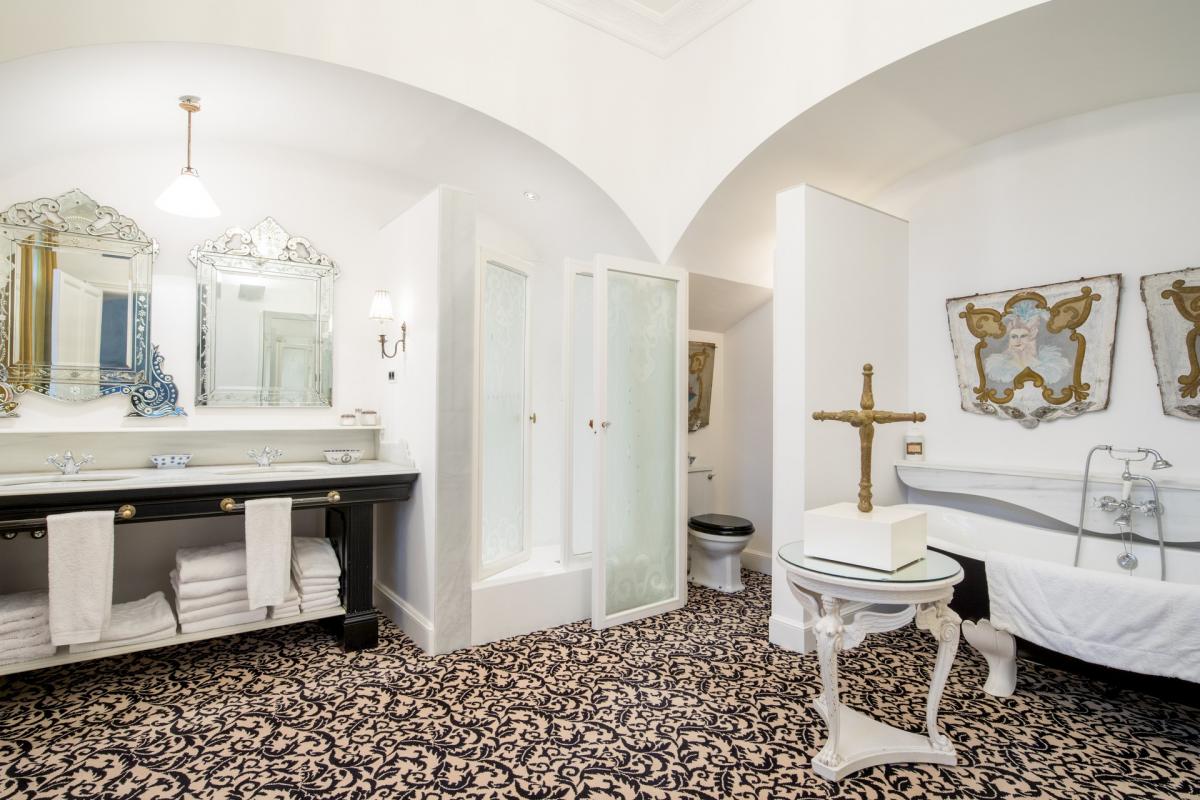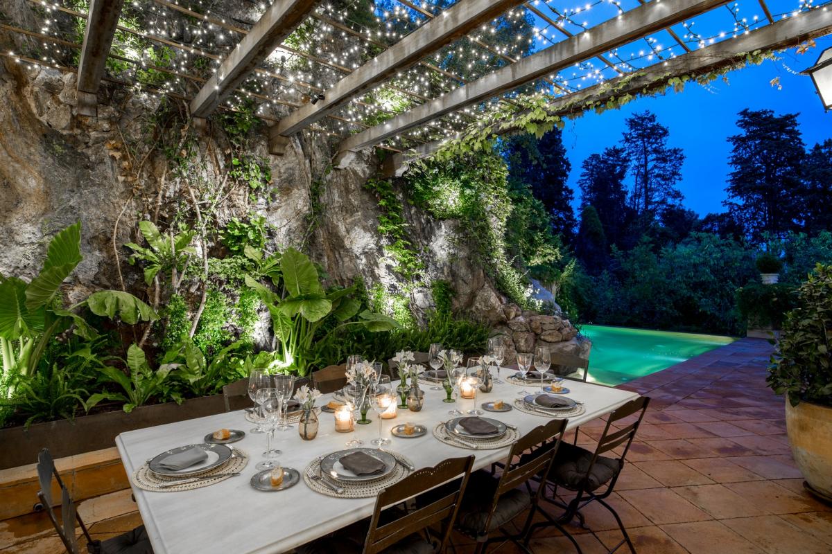 Villa 1904 is accessed via a prestigious, private road in middle of the city, where once you enter through the private gates you’ll arrive at the splendidly palatial entrance. On the home’s main floor, the grand living room was decorated by one of Spain’s top interior designers with a mix of antiques and modern furnishings. A cozy den opens up off the living area with TV, fireplace with ornate wooden mantle and intimate sitting area overlooking the gardens. The extravagant ceilings are 15 feet high, typical of the modernist era, with delicate crown molding, period trim and details that transport guests back to a more lavish and regal time. Opening off this room is an eclectic office which also functions as library with books shelved as high as the ceiling. The dining room boasts a red lacquer table for 12 which seamlessly unfolds into the outside patio and alfresco dining area for eight, sheltered by a floral entwined gazebo. The patio on this level is carved out of the mountain rock and surrounded by vegetation eventually opening up to a stunning natural shaped pool carved into the rocks. Relaxing on the terracotta tile patio with a plethora of lounge chairs and bistro seating, guests absorb the spectacular view of the city with beautiful sea beyond. The state of the art kitchen, informal dining room and cellar are also located in this level.