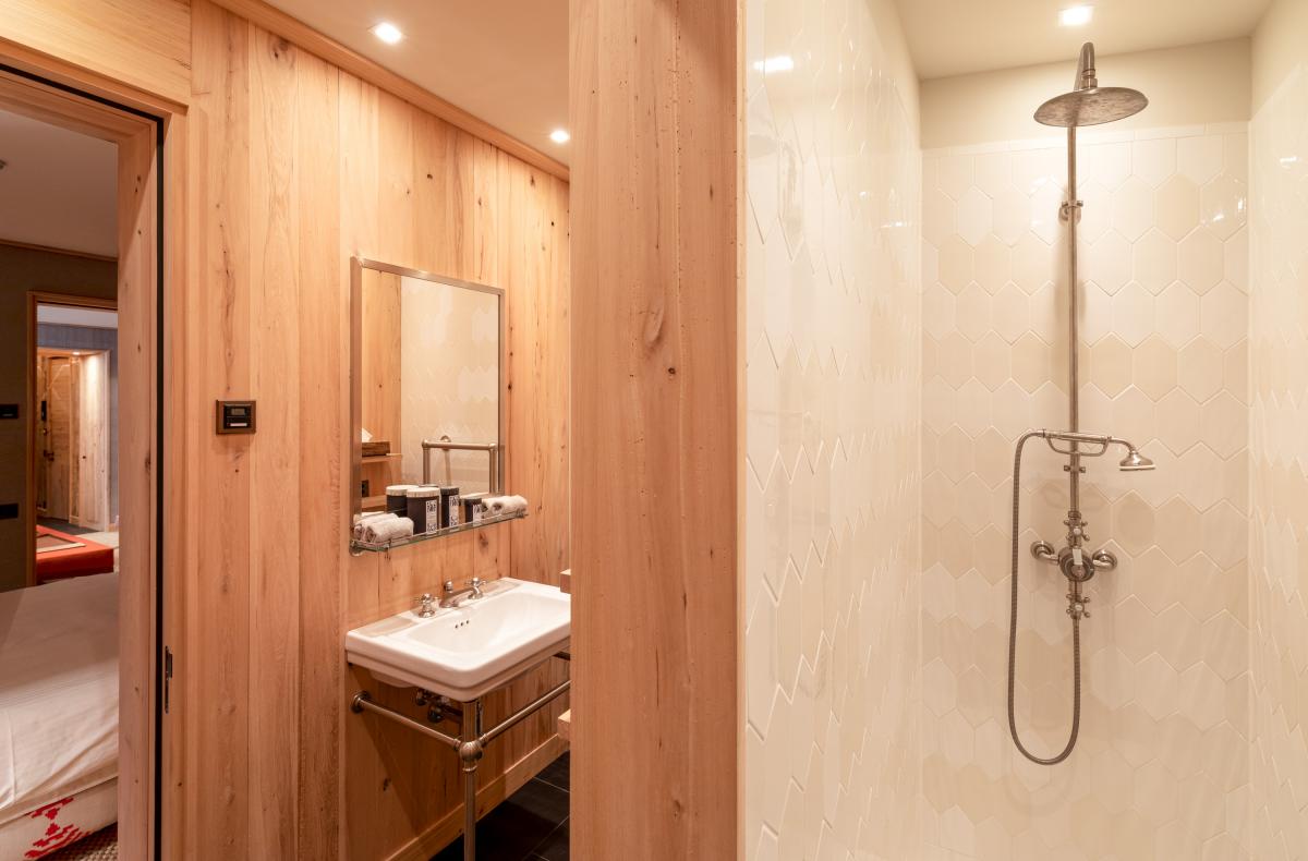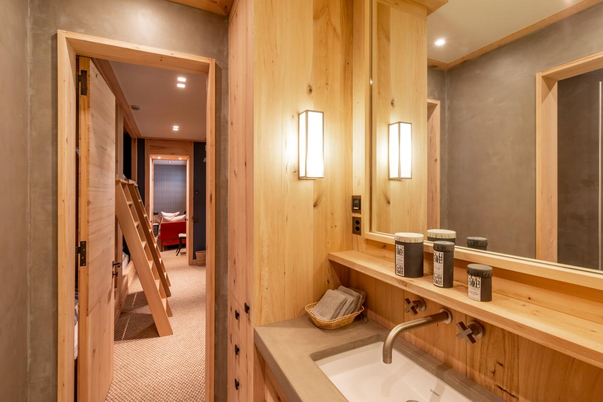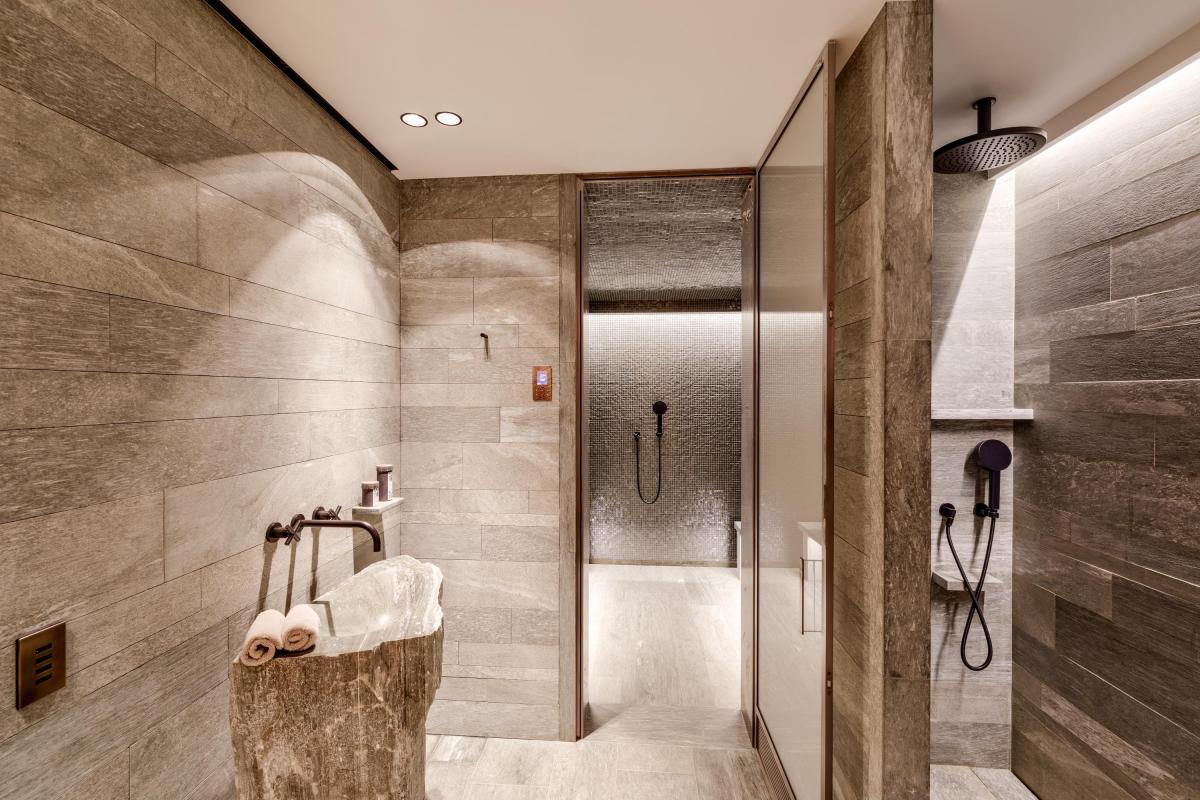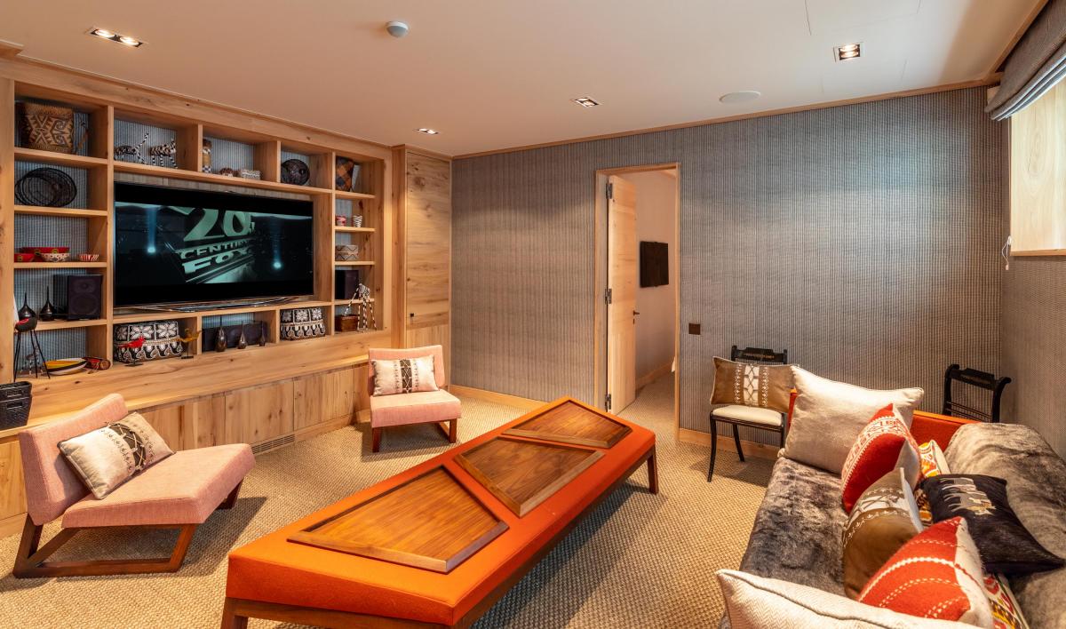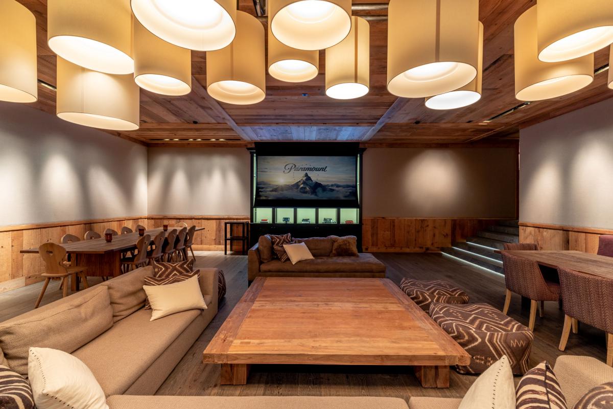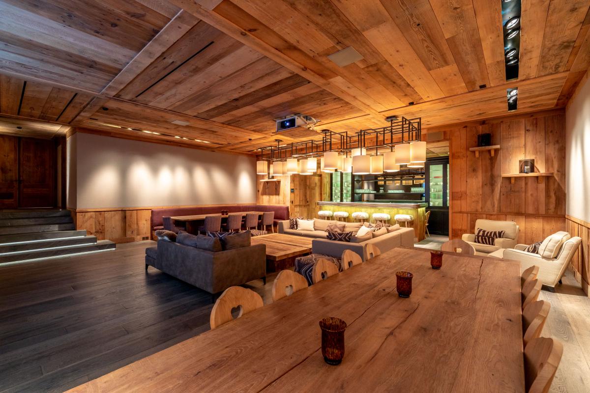 The opportunities for entertainment abound in Luxury Gstaad! A community entertainment space is shared by all three homes within the structure and features a massive multimedia room with lounge lighting above a series of sectional sofas for watching movies on the projector screen, two large dining tables for family meals and games as well as a full bar with sheepskin stools for five.