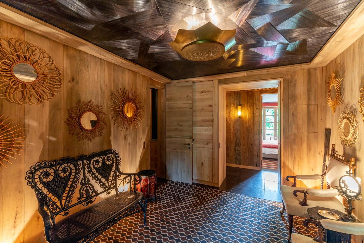An intricate entry boasts plenty of seating for shoe removal, wooden walls and a wavy tile floor, which also plays host to a powder room for added convenience. Beyond the foyer, the kitchen has a breakfast table for ten, surrounded by hand-planed wood walls, custom cabinetry and wooden ceilings, as well as a buffet and an industrial-size refrigerator/freezer. Large tile floors continue from this space into formal dining room and living room, complete with dual French doors, wood burning fireplace and ample seating between its two sectional sofas and matching benches.