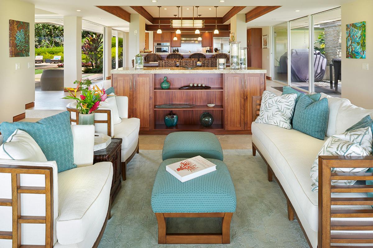 Villa Hale Nene has includes designer furnishings and a 70 inch flat screen TV in the media room. Stainless appliances, gas cooktop, and large island make cooking in the chef's kitchen enjoyable for both family and friends. The king master suite features a sitting area and 55 inch flat screen TV while the en suite bath includes his and her sinks, a large tub with view & fabulous private outdoor shower. Villa Hale Nene offers another king suite and another suite with two queen beds. In all, the home accommodates up to 6 guests. Close to beautiful beaches, golf courses, shopping and activities.