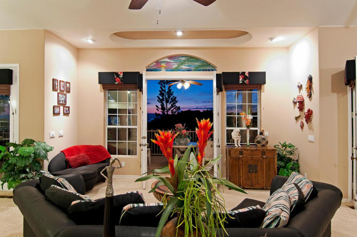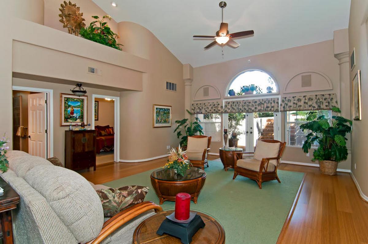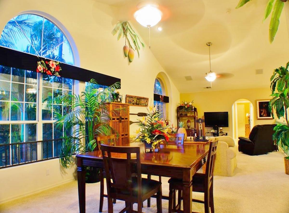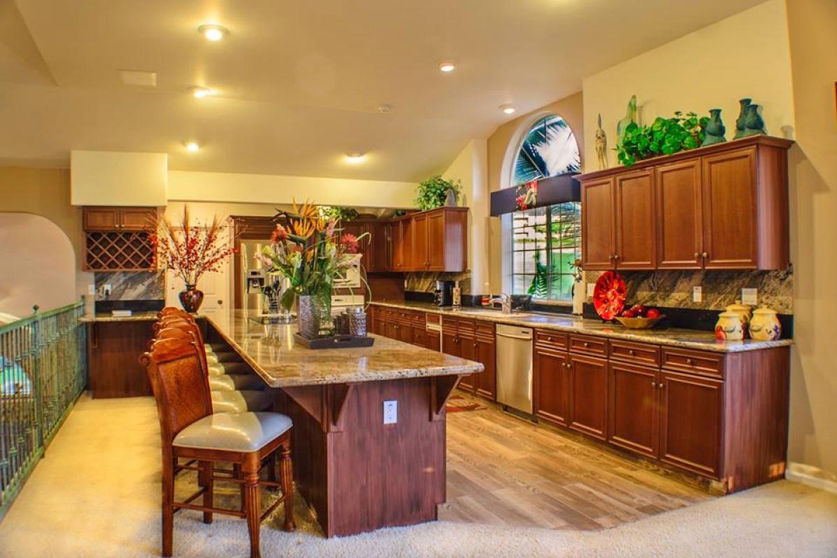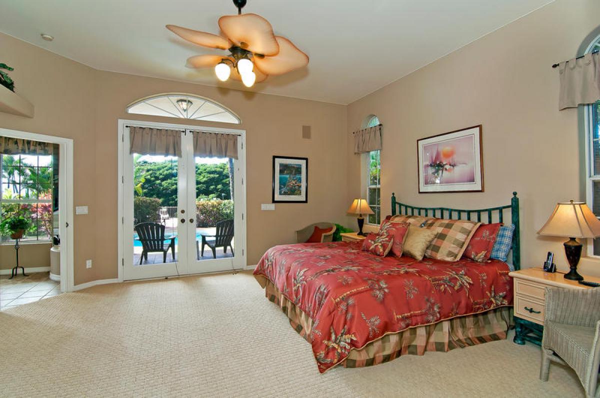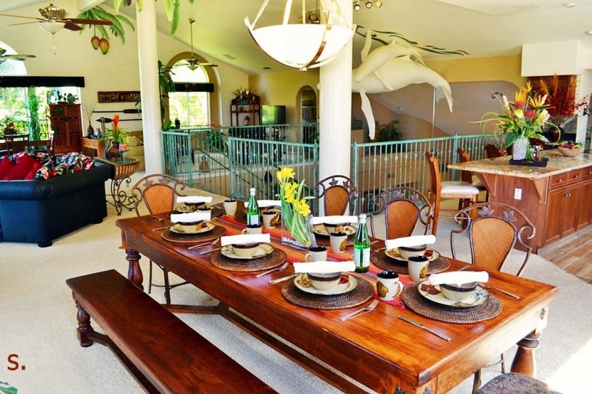 Reaching the 2nd level you realize just how expansive this home is! An enormous open ‘U’ shaped floor plan incorporates large welcoming kitchen, dining and living area complete with gaming table, large screen TV, stereo and DVD player. This truly is a home designed for large scale entertaining and fun. But wait, there’s more, open the French doors to lanai in living and dining areas to view ocean sunset, surrounded by layered tropical foliage. Also on the 2nd level are 2 bonus rooms and a full bath. One located just behind the kitchen which includes a daybed, perfect for children. Another near the bathroom with a king bed. These rooms are wonderful for overflow.