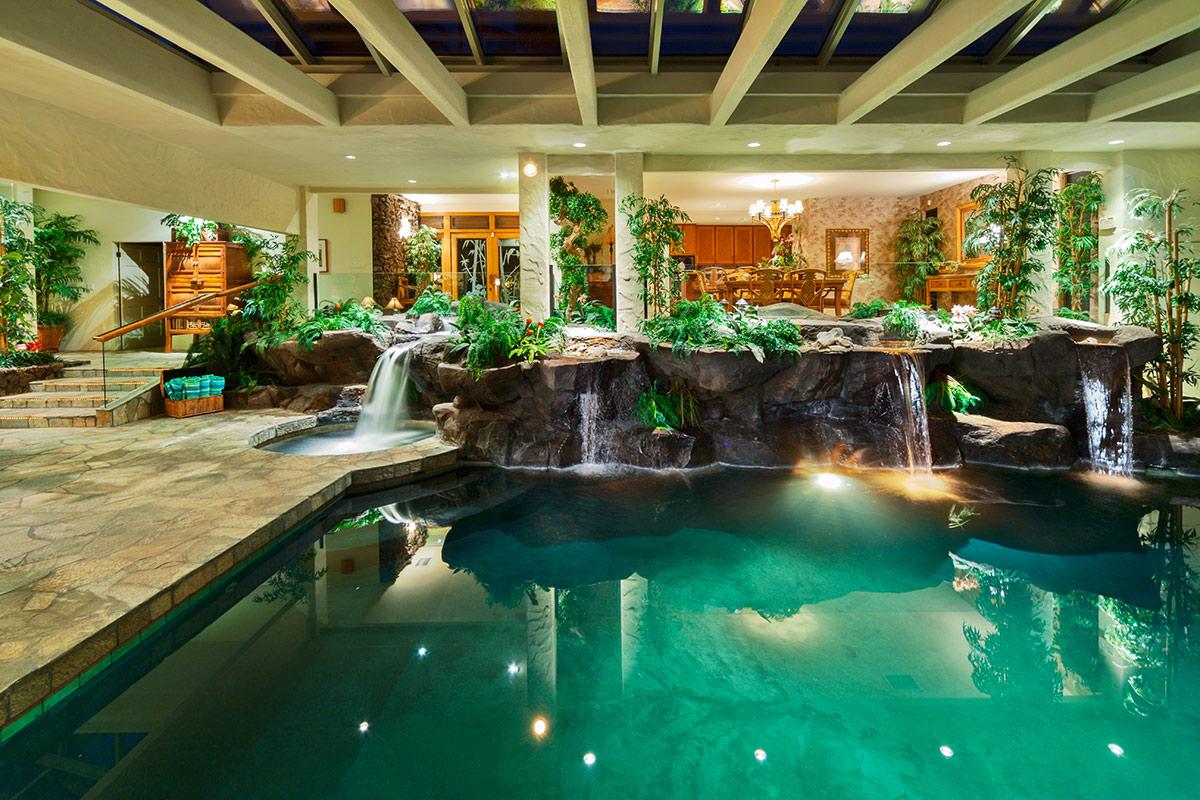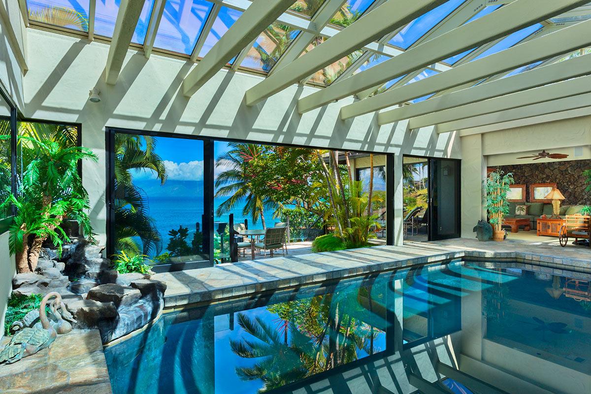Function and design meld to create this distinctive Kapalua home with pool, waterfalls and Jacuzzi — all saline filtered NO chlorine smell — the water is soft and inviting! Situated for perfect indoor/outdoor use the pool and spa area has glass doors that slide away, opening your sanctuary to ocean breezes.