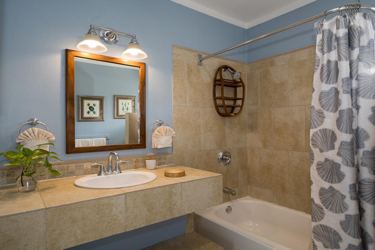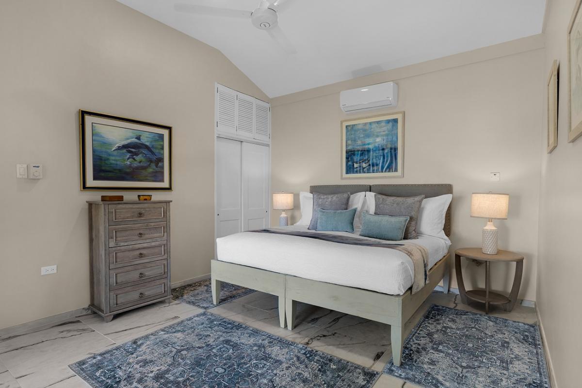 Bedroom 3: This room is located on the upper level. It has a king-sized bed, a closet, and French doors that open to a private balcony with a sea view. Bedroom 3 has a small ensuite bathroom with a shower and single vanity.