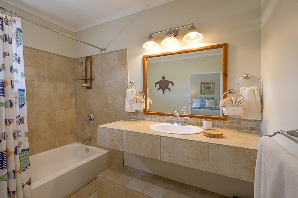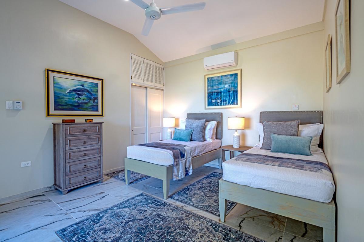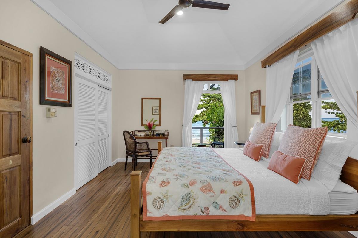 Bedroom 1: This room is located on the ground floor. It has a king-sized bed, a closet, and French doors that open to a lawn terrace and sea view. Bedroom 1 also has an ensuite bathroom equipped with oversized single vanities, a separate toilet, and a walk-in rain shower.