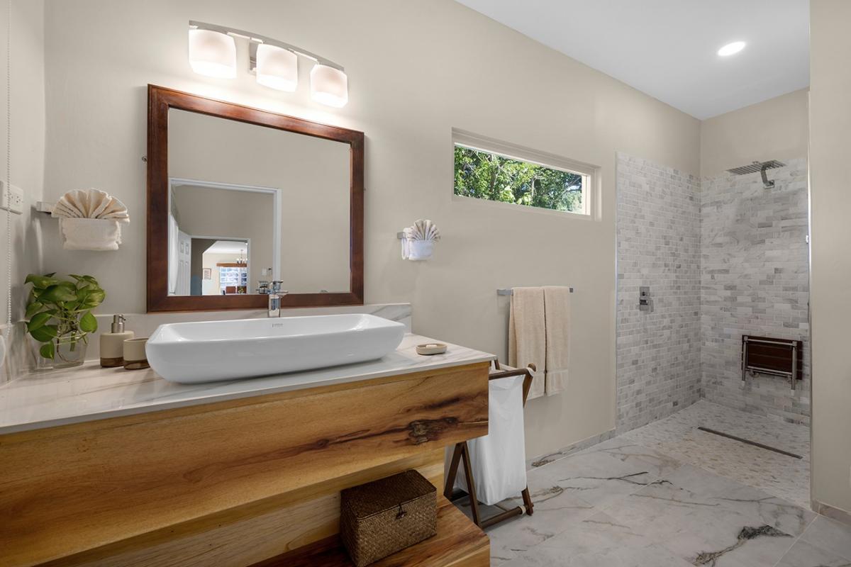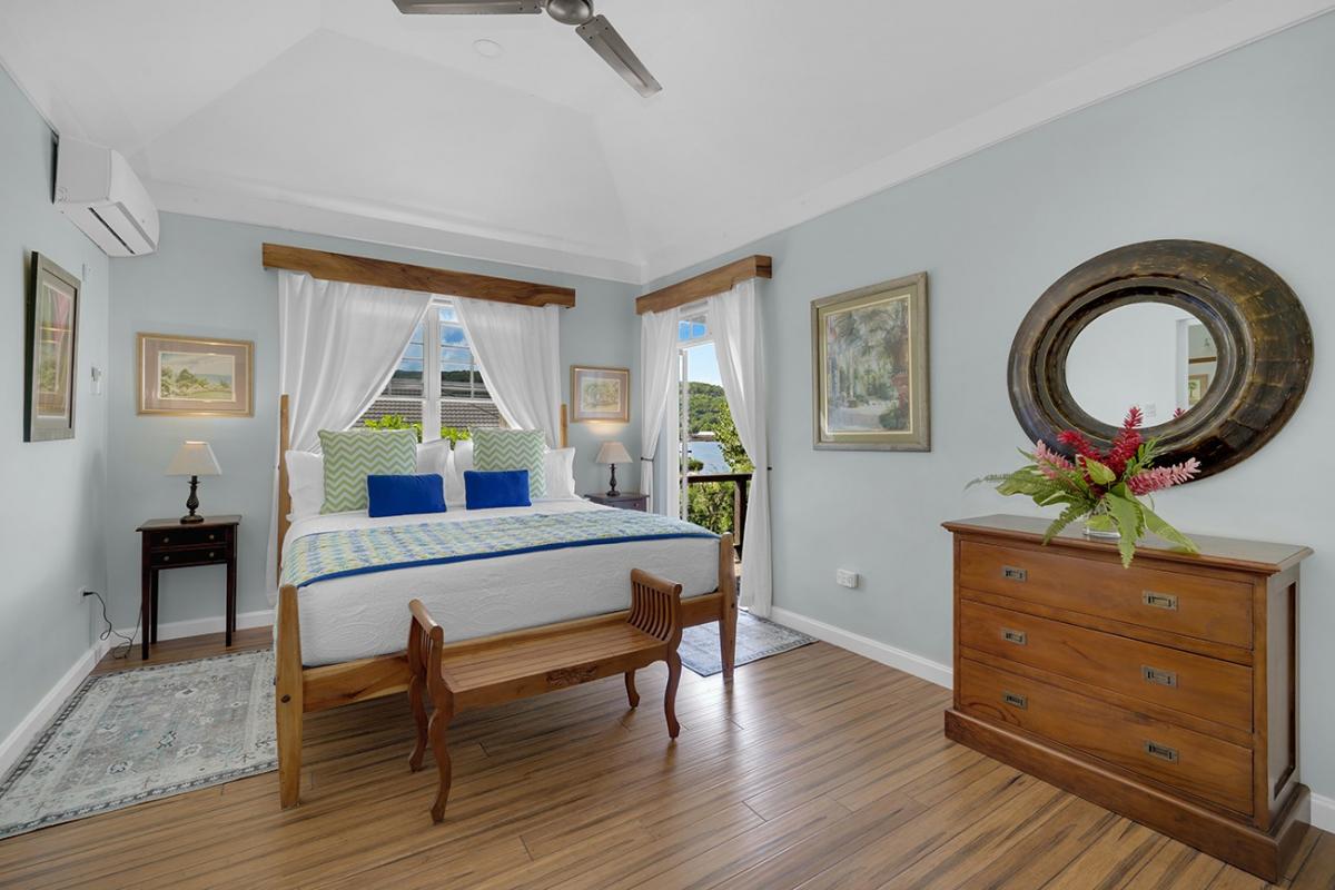 Bedroom 2: This room is located on the upper level. It has a king-sized bed, a closet, and French doors that open to a private balcony with a sea view. Bedroom 2 has an ensuite bathroom with double vanities and a large walk-in rain shower.