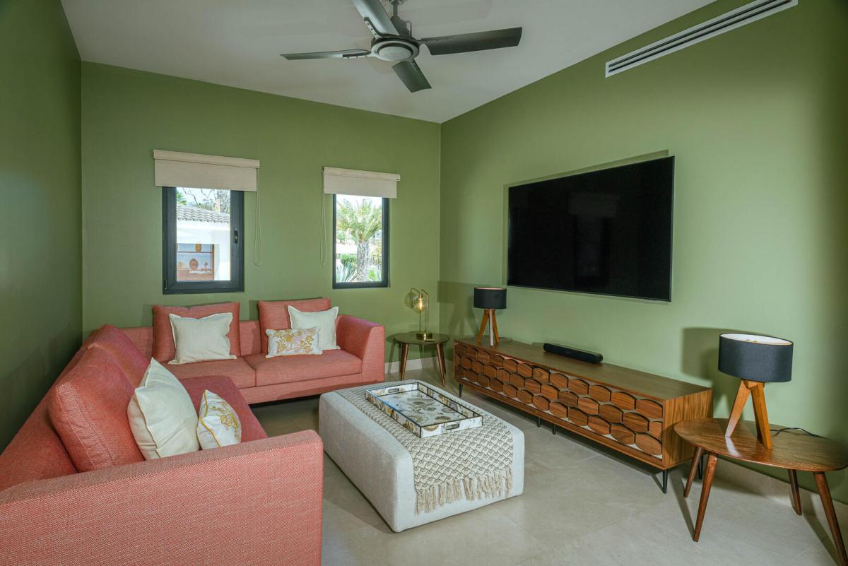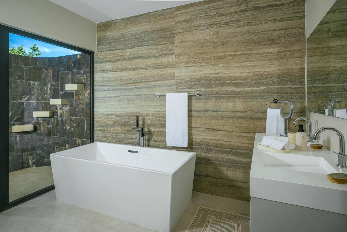 The villa features six beautifully designed bedrooms, five of which offer sweeping ocean views. Accommodating up to 12 guests, Casa Alba’s interiors showcase a refined sense of luxury, with custom Italian-made kitchen and bar, as well as hand-selected European furnishings and lighting. The bedrooms are styled with crisp white linens and soft, earthy tones, and include upscale features like digital TVs, smart speakers, and outdoor showers in select rooms. The open-plan layout seamlessly connects indoor and outdoor living, with large sliding glass doors allowing fresh ocean breezes and natural light to fill the space.
