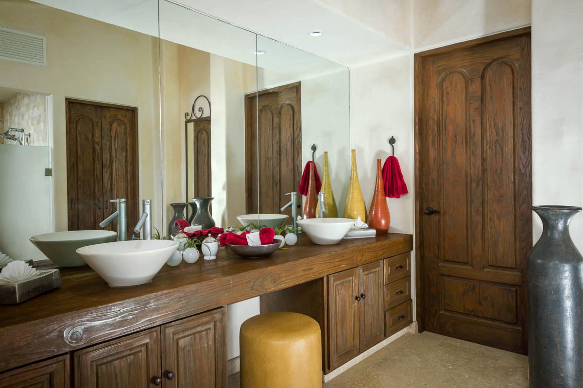 Some of Casa Alegria’s best amenities are located in the outdoor living space. A huge palapa houses hammocks and the patio is filled with plush lounge beds. The center of the terrace is the stunning tiered swimming pool which is connected to a large river rock waterfall. The Jacuzzi is raised so guests can look over the beautiful waves of the Sea. Other amenities include 2 swimming pools (one on the upper and lower level), an 80 inch flatscreen TV with surround sound, and high speed cable internet with WiFi.