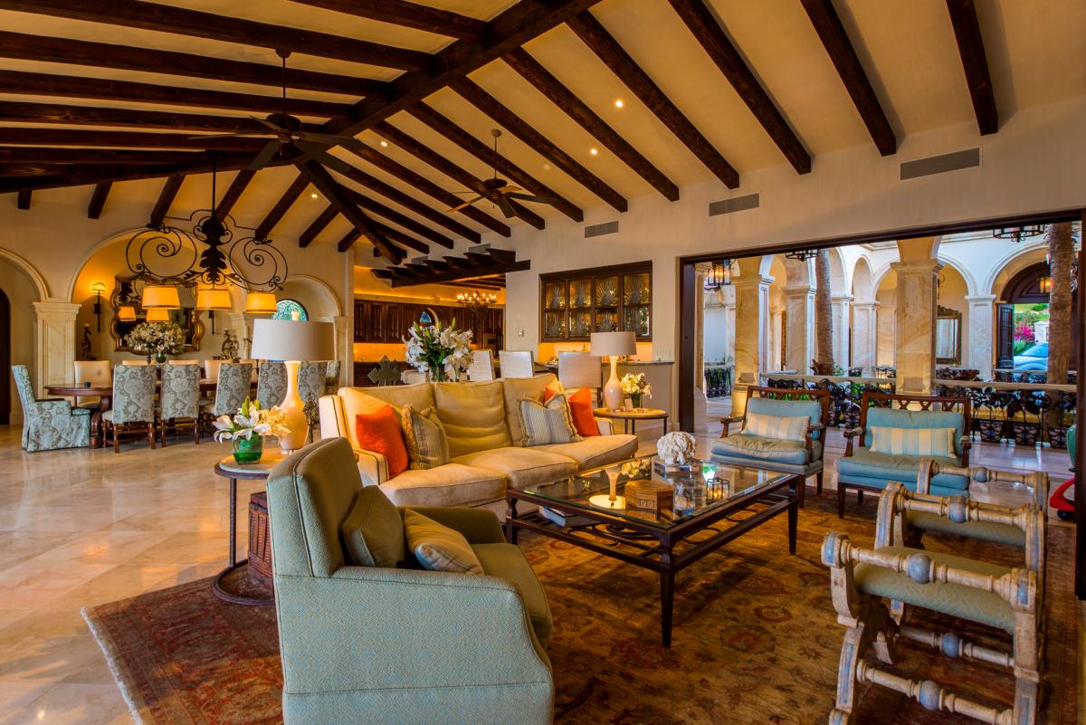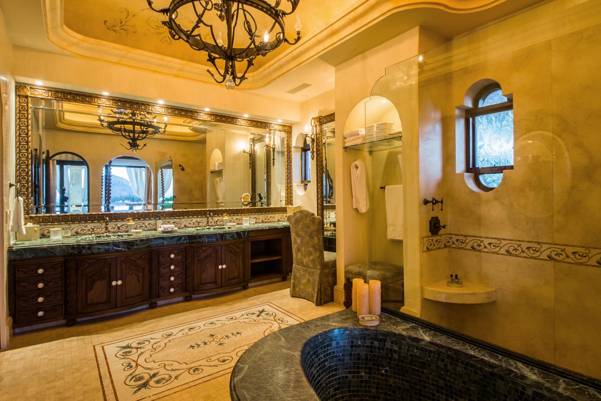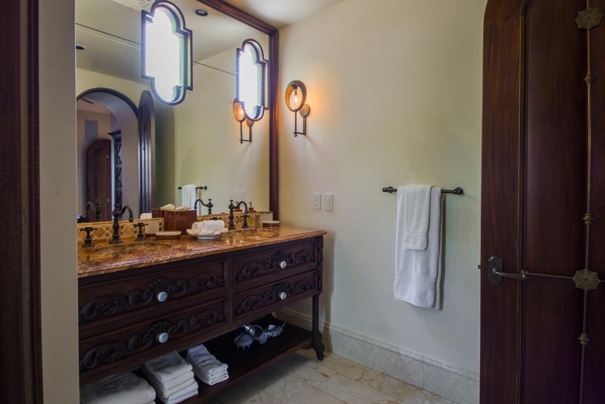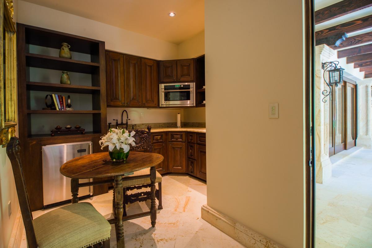 The sheer size of the contoured infinity swimming pool with swim-up bar and inset lounging areas is simply astounding. Little could be as soothing as a well deserved soak in the outdoor experience gather around the dining area for some fresh appetizers and drinks. Upon request, have your private chef prepare culinary delights to your liking. The interiors of Casa Milagros are elegant and capacious, with an open floor plan, all rooms are intertwined. The kitchen features premium stainless steel appliances, marble countertops, a 4-seat breakfast bar, prep sink and pantry. Rustic wood-beamed ceilings complement the expanse of rich cabinetry, with the engraved stone range hood and wrought iron chandelier adding historic charm. Enjoy some drinks by the bar, or get cozy by the beautiful fireplace. Intriguing artwork are placed throughout the property and add a sense of whimsicality to the pristine ambience.