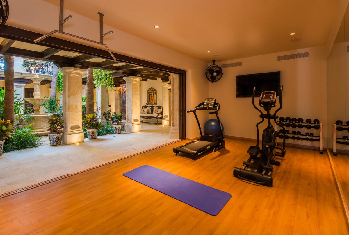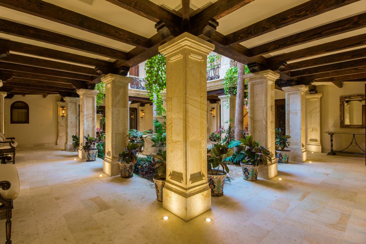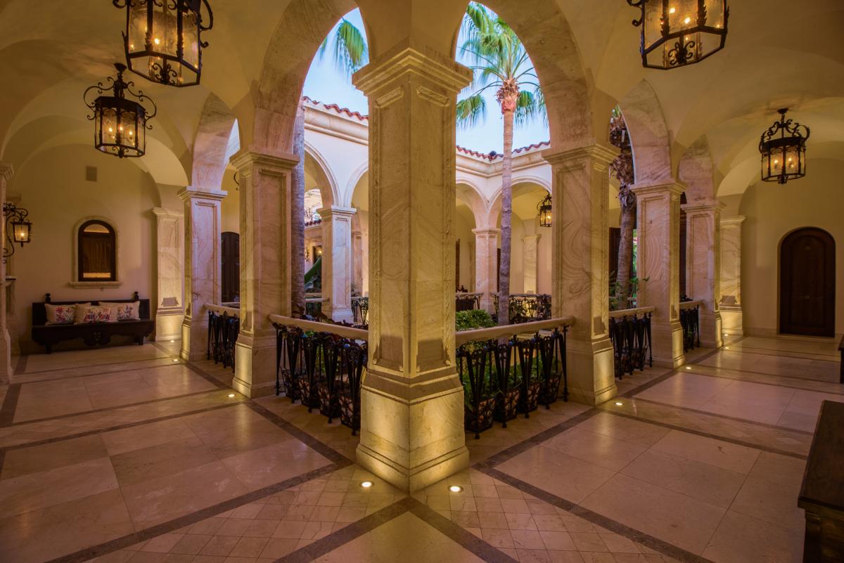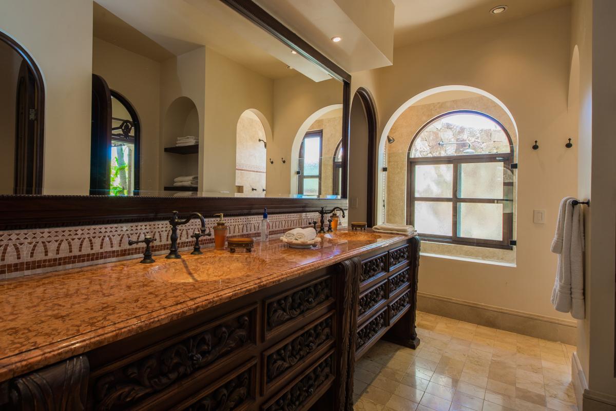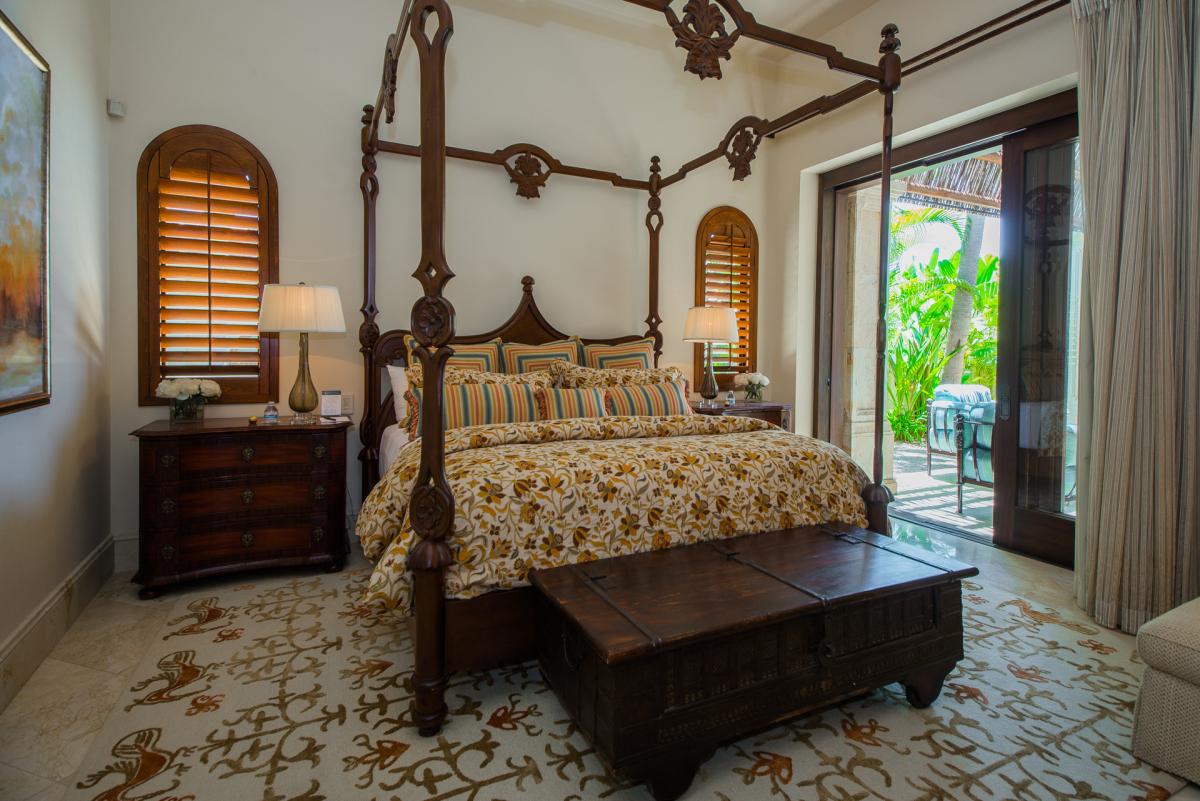 The sheer size of the contoured infinity swimming pool with swim-up bar and inset lounging areas is simply astounding. Little could be as soothing as a well deserved soak in the outdoor experience gather around the dining area for some fresh appetizers and drinks. Upon request, have your private chef prepare culinary delights to your liking. The interiors of Casa Milagros are elegant and capacious, with an open floor plan, all rooms are intertwined. The kitchen features premium stainless steel appliances, marble countertops, a 4-seat breakfast bar, prep sink and pantry. Rustic wood-beamed ceilings complement the expanse of rich cabinetry, with the engraved stone range hood and wrought iron chandelier adding historic charm. Enjoy some drinks by the bar, or get cozy by the beautiful fireplace. Intriguing artwork are placed throughout the property and add a sense of whimsicality to the pristine ambience.