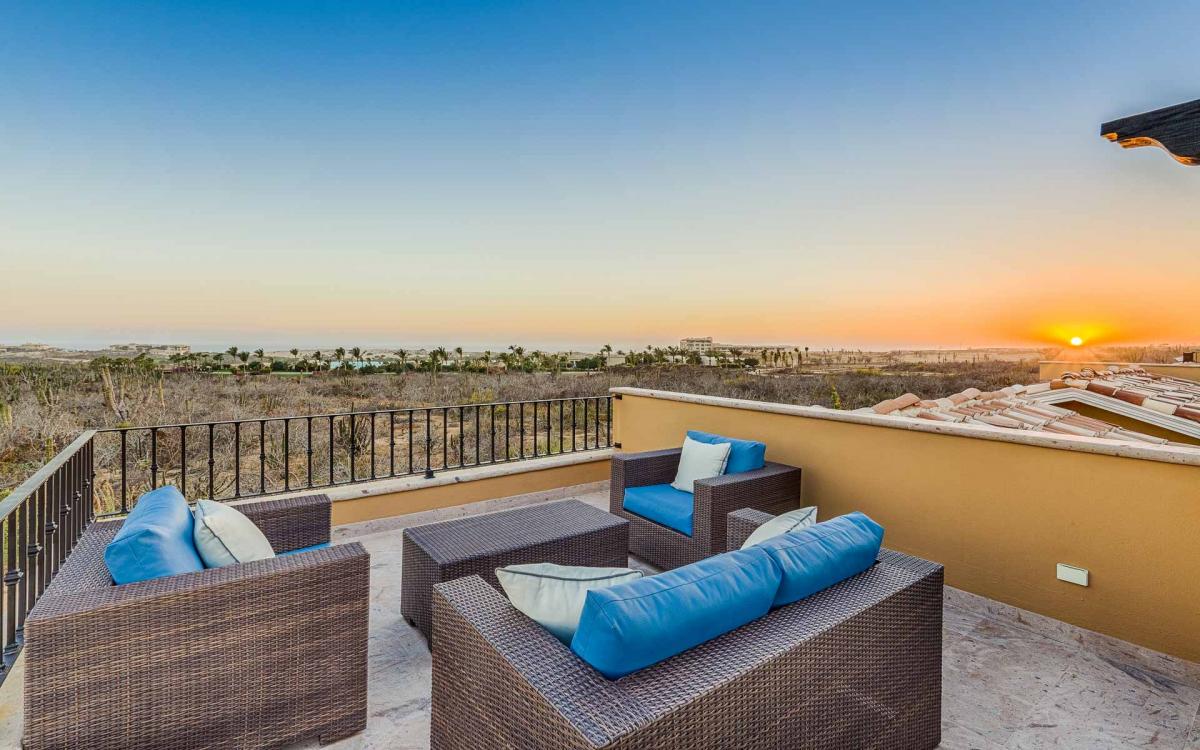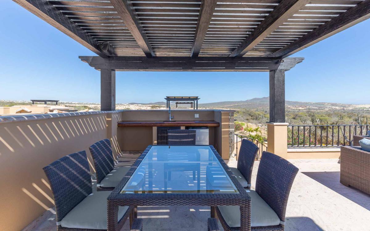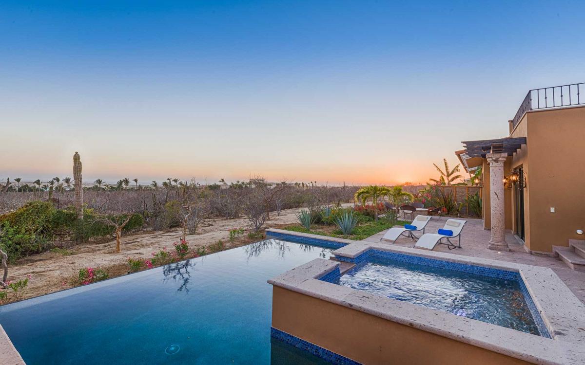 The villa's exterior features a ground-floor terrace cloistered within elegant walls, and a rooftop terrace with beautiful golf course views. On the ground floor, a hot tub cascades into an ample swimming pool. Elegant loungers invite you to enchanting hours in the Los Cabos sun, while the firepit keeps you toasty under the stars. In the afternoon, repair to the rooftop terrace for an alfresco lunch beneath the pergola, and linger there at sunset to savor the panoramic vistas.