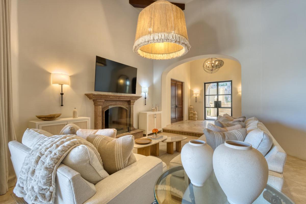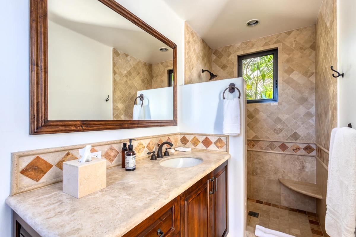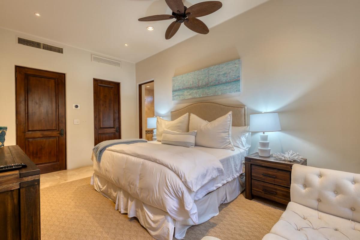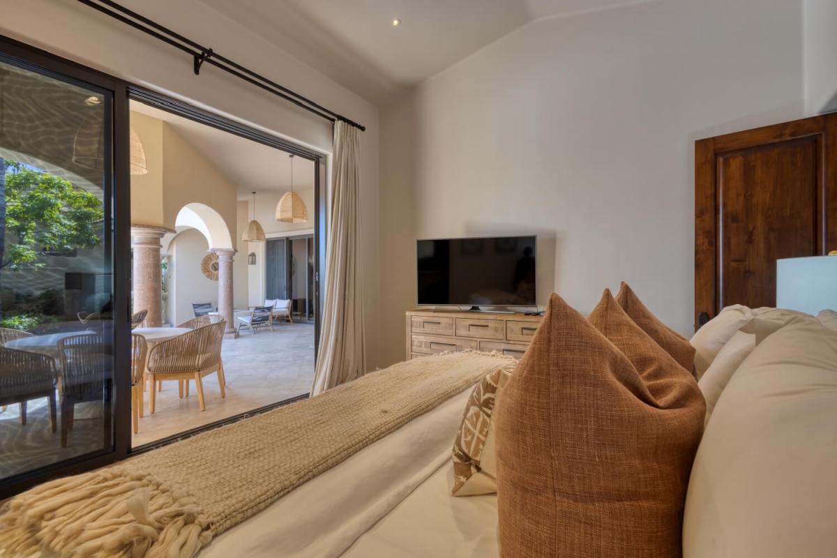 This Cabo villa rental has a beautiful open kitchen, elegant decor, and a dining area. Next to the kitchen is a lovely sitting room with couches and a smart TV, which gives guests a place to relax indoors. Five bedrooms can accommodate up to ten guests. The primary bedroom has a king-sized bed, access to the pool area, a private lounge space, and an amazing ensuite bathroom with a jacuzzi. The remaining four bedrooms all have ensuite bathrooms.