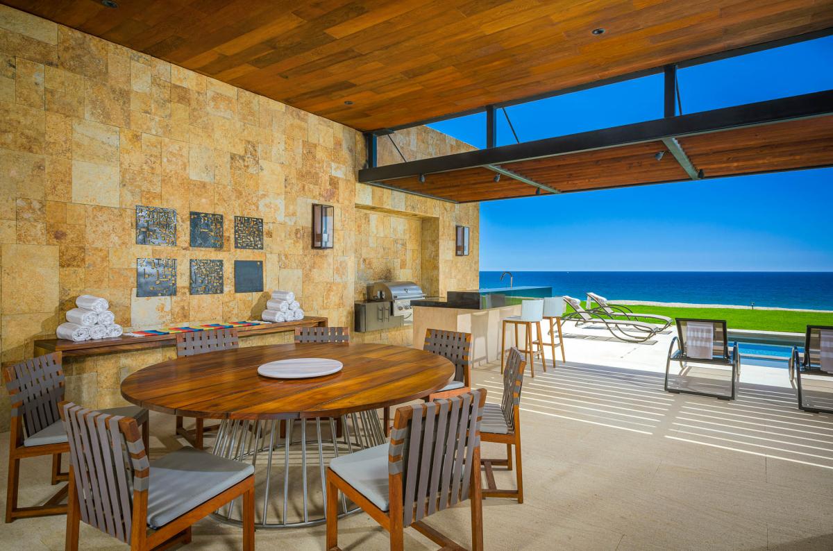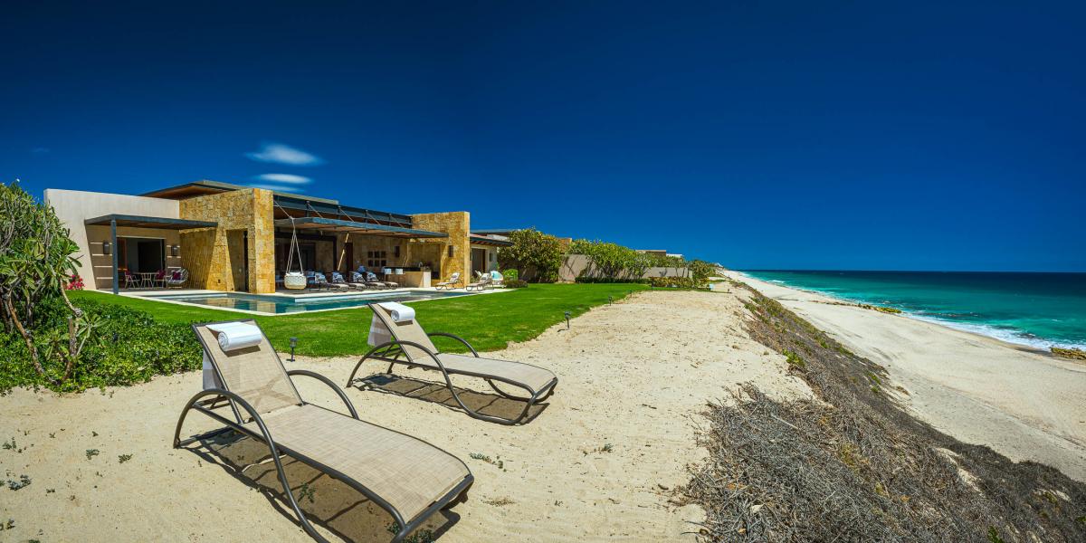 An upscale, beachfront experience in the exclusive Puerto Los Cabos community, West Enclave #4 offers five bedrooms and 6.5-baths. This desert contemporary home blends seamlessly with its natural surroundings while elevating luxury to new heights. Accommodating up to 11 guests, this Los Cabos villa provides a nearly private experience on the beachfront, within one of the region's most celebrated master-planned communities. The outdoor space is designed to take full advantage of the stunning Sea of Cortez views, featuring a heated swimming pool, Jacuzzi, eight deck loungers, a gas grill, an outdoor wet bar, and al fresco dining options. The space also includes an outdoor stereo system, a full outdoor living room, and a fire pit with seating right on the sand.