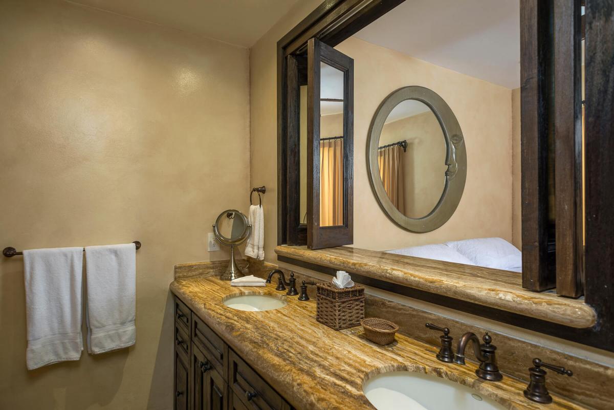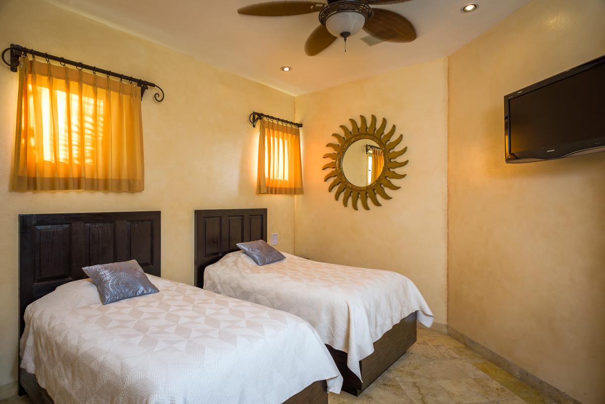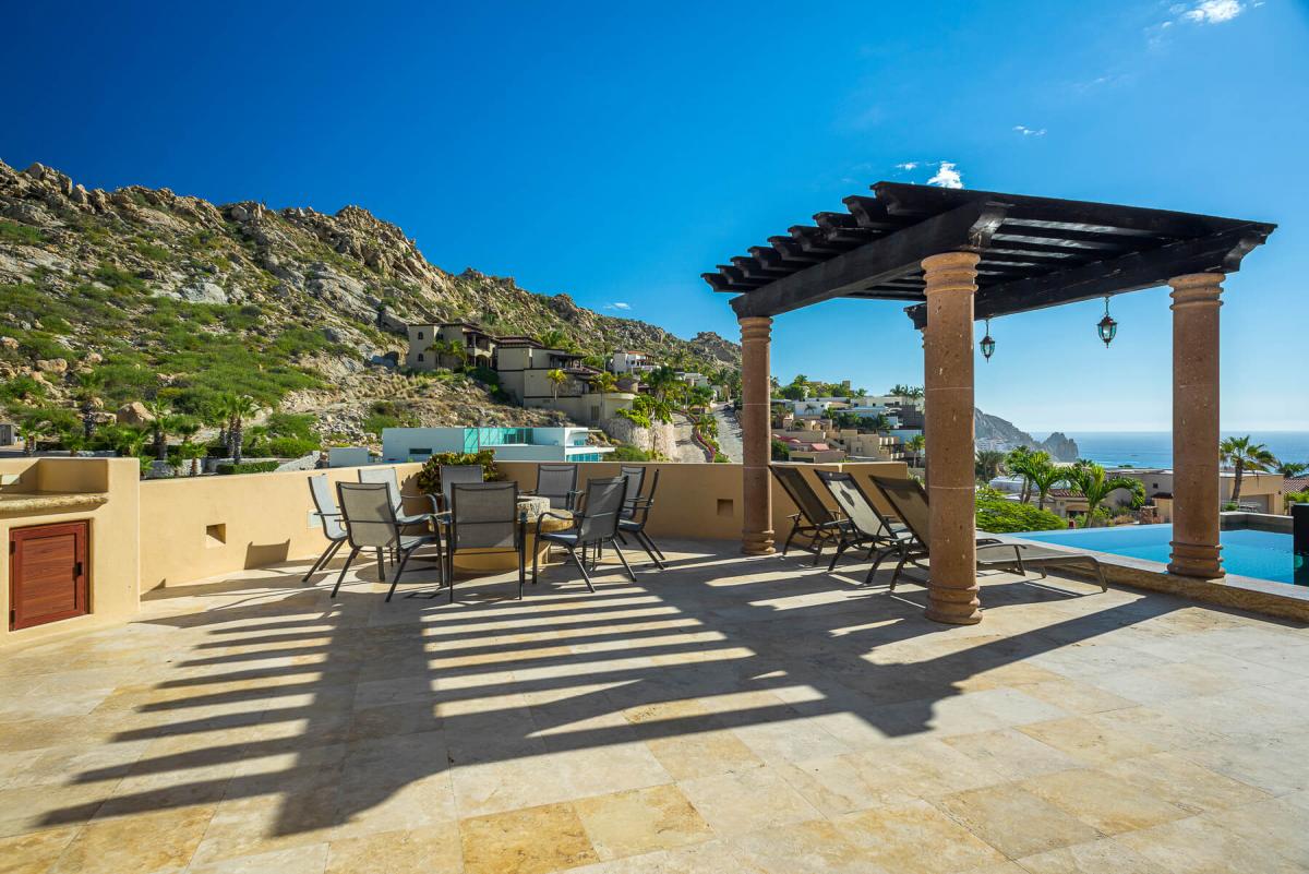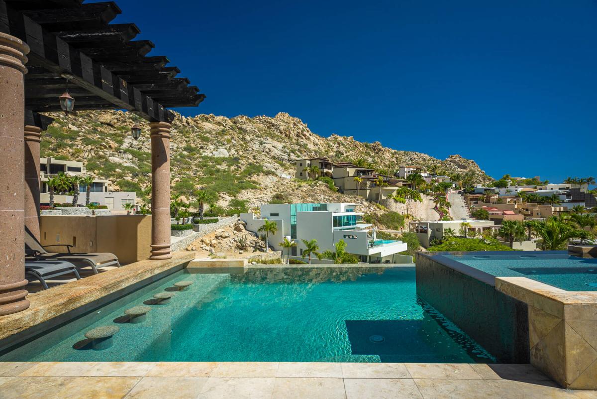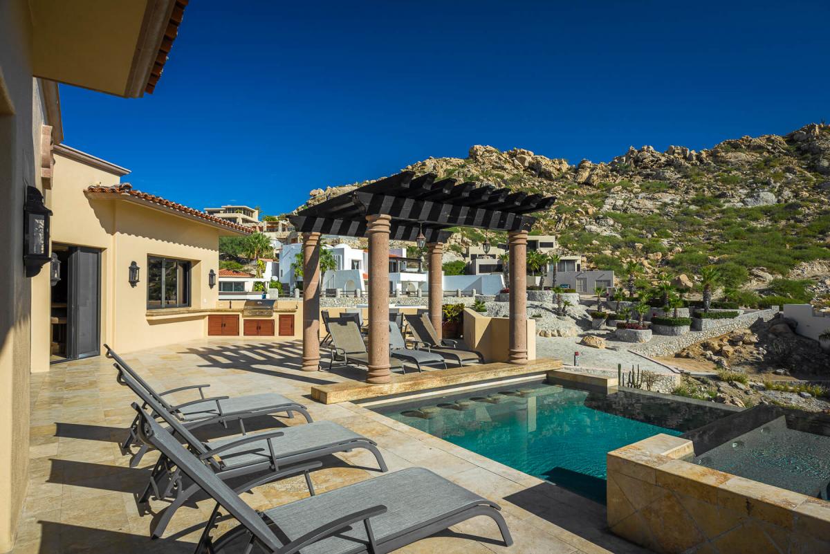 The main floor of Villa Descanso is designed for entertaining. There is a large living area that is completed with a sports room with a pool table, a large great room with a 46-inch flat-screen TV, a media room with a 46-inch flat-screen TV, a large gourmet kitchen with an indoor and outdoor counter seating for nine guests and a 32-inch flat-screen TV, and a dining room that accommodates twelve guests. The outdoor area of Villa Descanso has a jacuzzi that can hold up to ten guests, an infinity-edge swimming pool with a swim-up bar. The terrace also has plenty of lounge and deck chairs so guests can all hang out together in the area. A pergola for shade, a fire pit, and a gas BBQ complete the outside area.