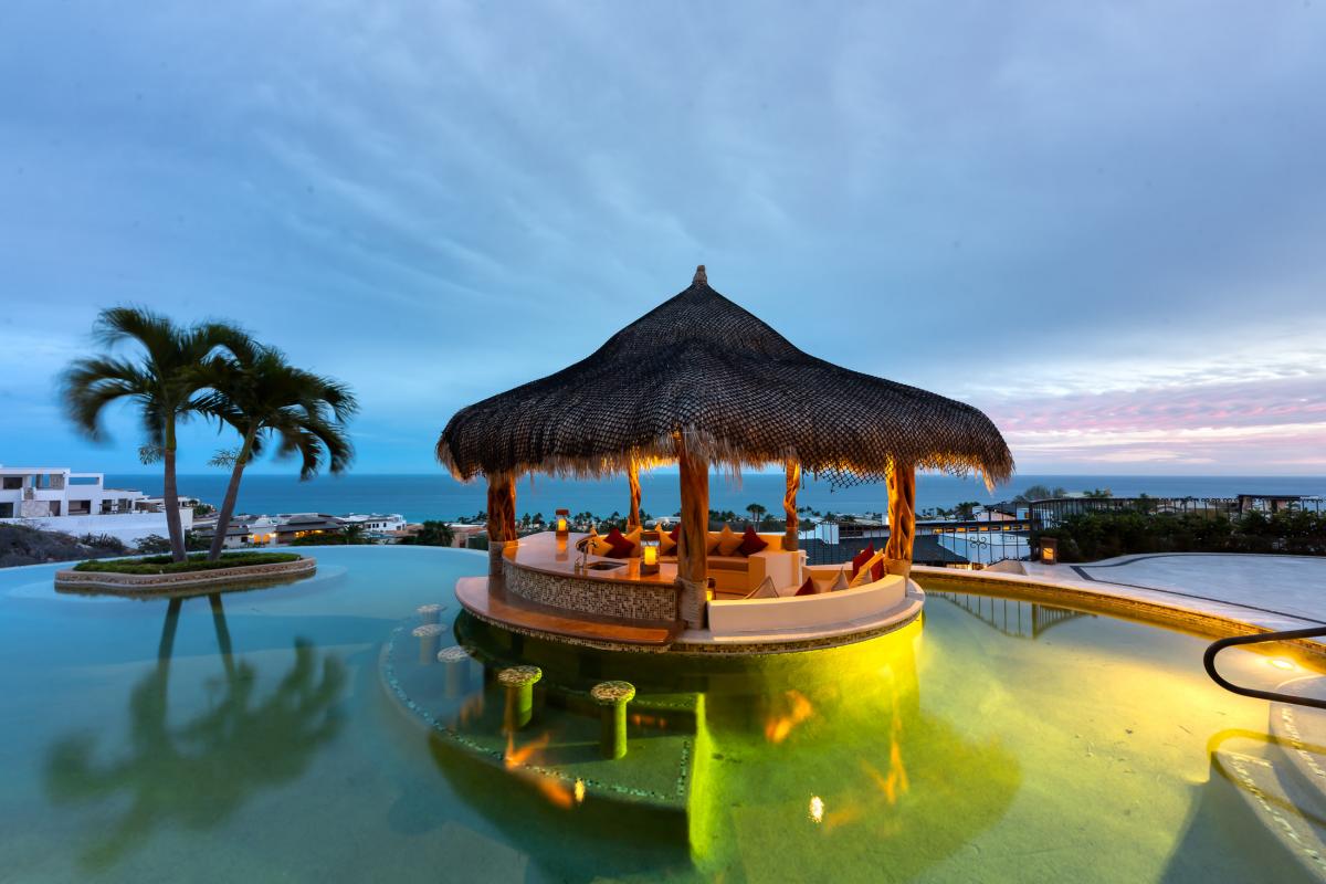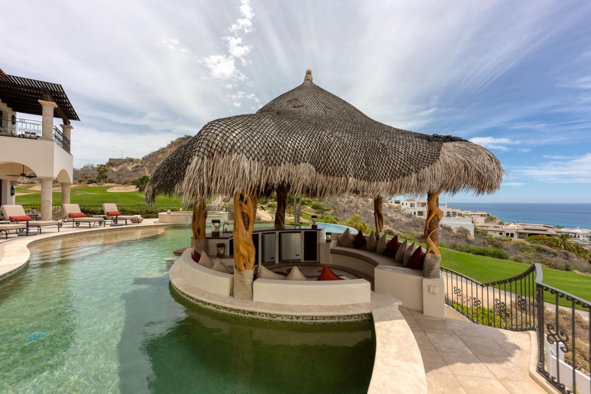 Located in Puerto Los Cabos, Villa Fondren is a Los Cabos villa offering a lavish retreat with breathtaking ocean views and top-tier amenities. Nestled in the gated Fundadores community, the six-bedroom, seven-bathroom villa provides a resort-like experience for up to 12 guests. The outdoor space features a stunning infinity pool with a swim-up bar, a jacuzzi, a firepit, and a shaded living area, all framed by palm trees and white arches, making it an ideal spot for relaxation and enjoyment