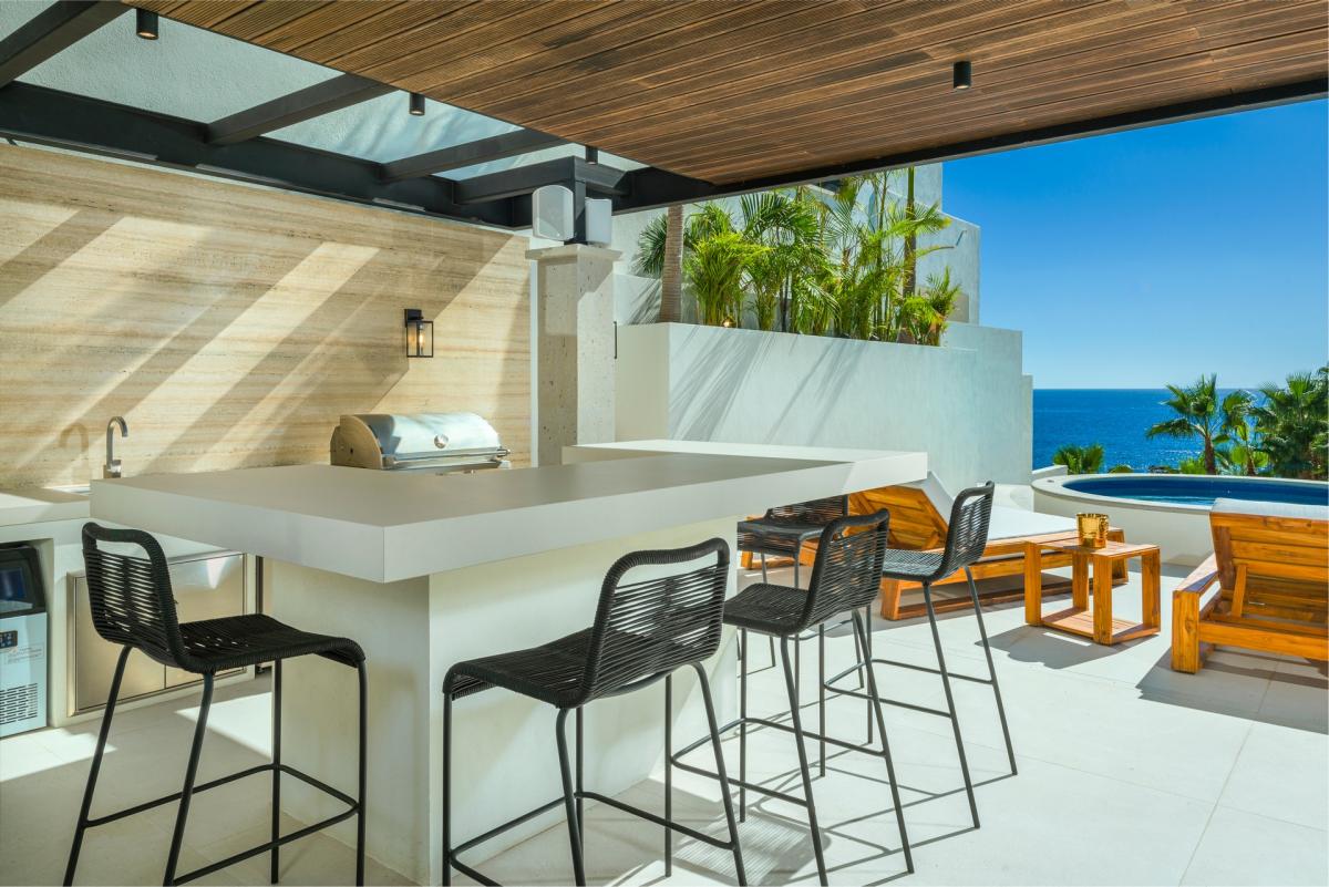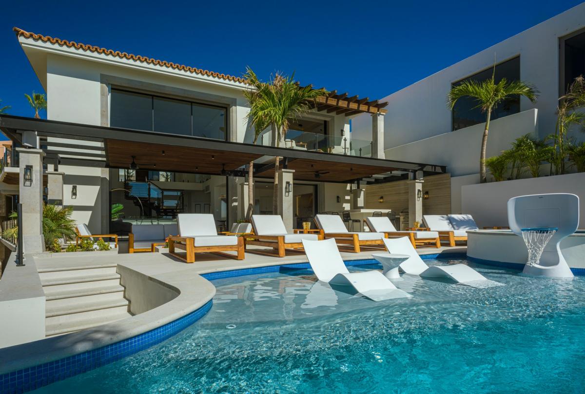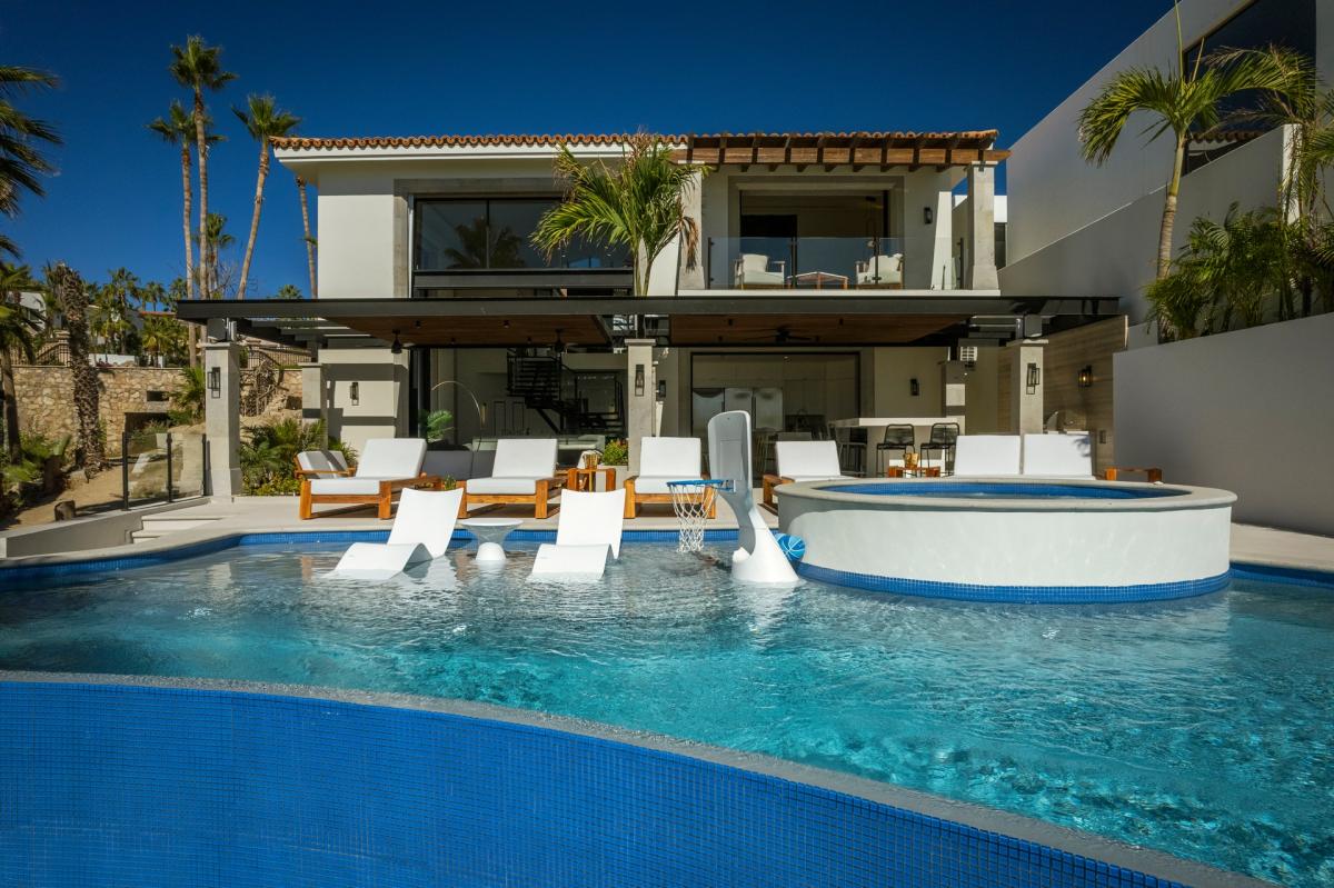 Villa Mareas is a luxurious five-bedroom villa retreat designed for sun-soaked fun and relaxation in Cabo San Lucas. This Los Cabo villa offers private, spa-like ambiance with opulent features such as a double-height sunken living room, gourmet kitchen, and walls of glass that blend indoor elegance with stunning outdoor views. Accommodating up to 10 guests, the villa boasts a partially shaded main pool deck, complete with a sunning pool, Jacuzzi, outdoor grilling area, and a conversation space. Guests can enjoy cocktails at the outdoor bar or dine inside, surrounded by sophisticated touches like a marble dining table, a sleek kitchen island, and chef-caliber appliances. Family-friendly amenities include a stereo system, pool basketball, and palm-framed vistas of the ocean and sunset.