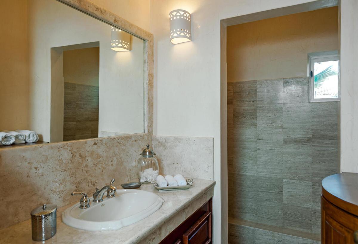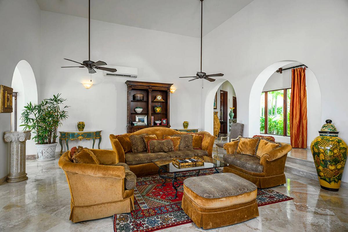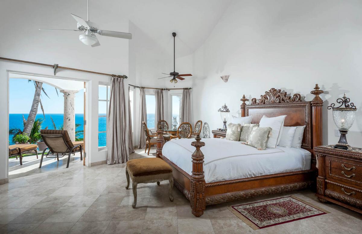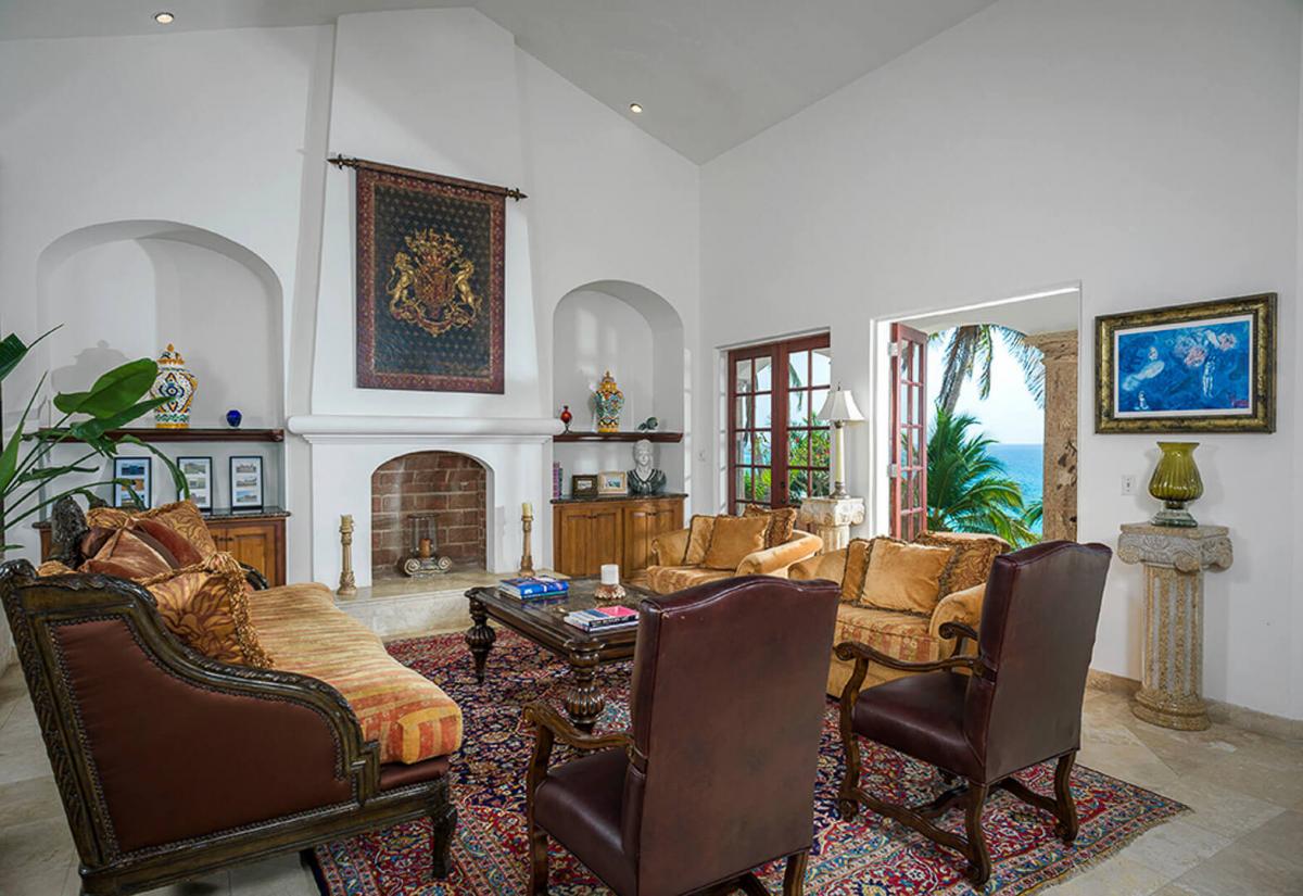 Villa Paraiso, blends European elegance with Mexican architecture, offering a luxurious retreat featuring Tuscan furnishings, brocades, and tapestries. The villa's design boasts high ceilings, marble floors, and open spaces highlighted by rich woods, white walls, and warm tones. The 7,000 square-foot villa includes five spacious bedrooms, each with a lavish ensuite bathroom, providing privacy and comfort for guests.