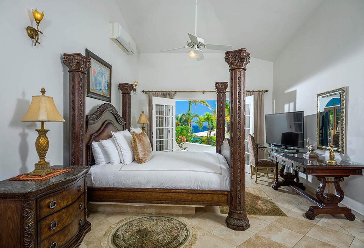 Primary Bedroom: King bed, ensuite bathroom w/shower, satellite TV, ocean view