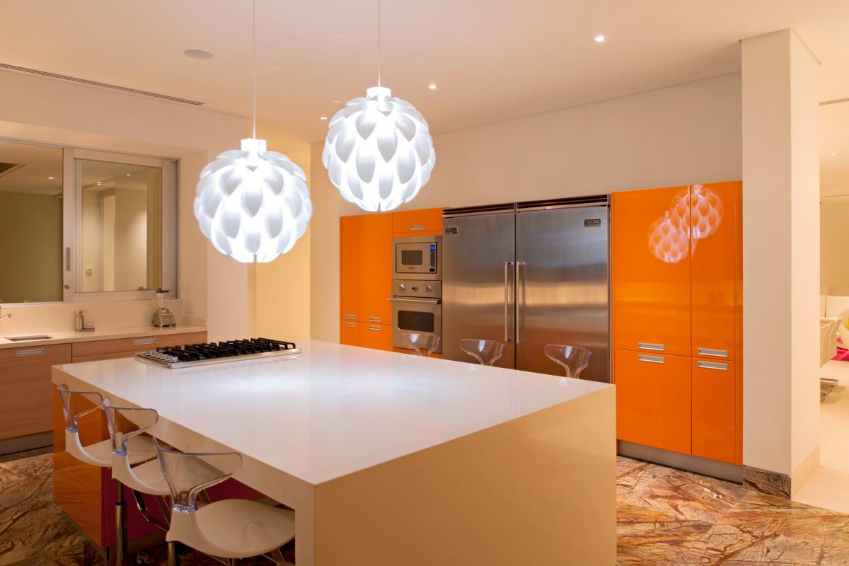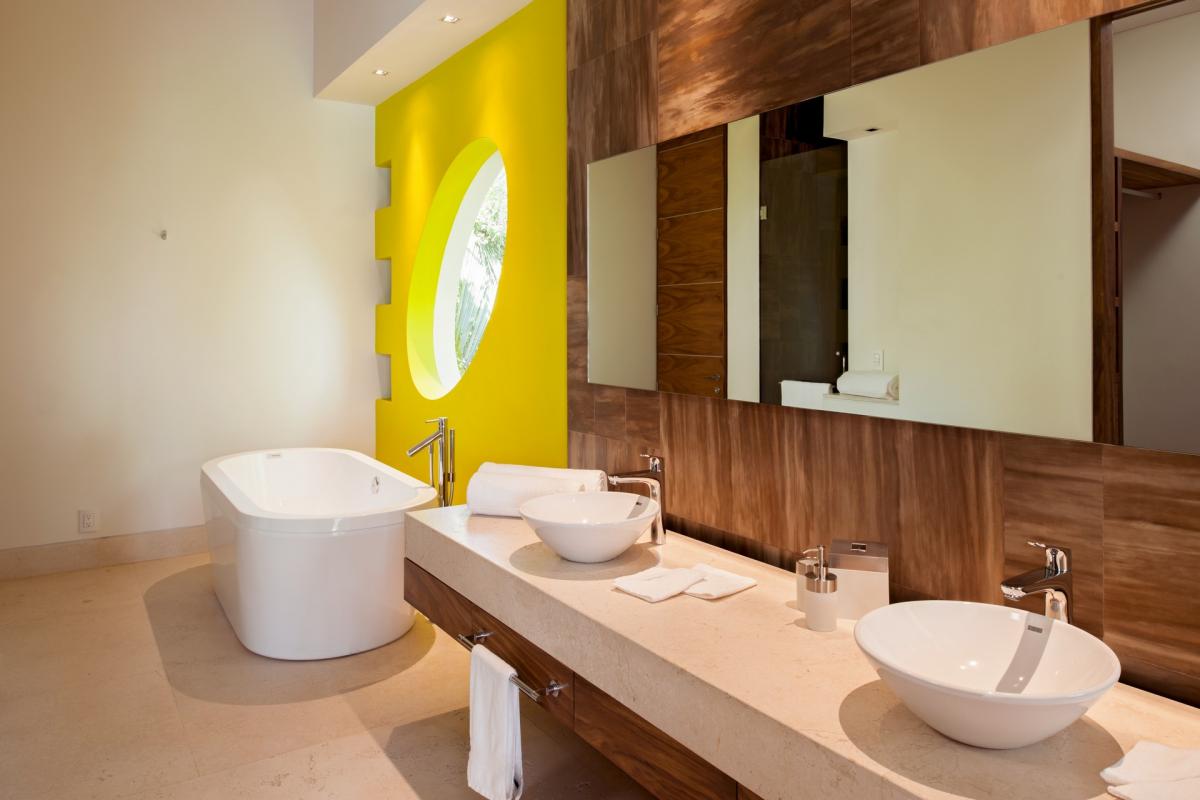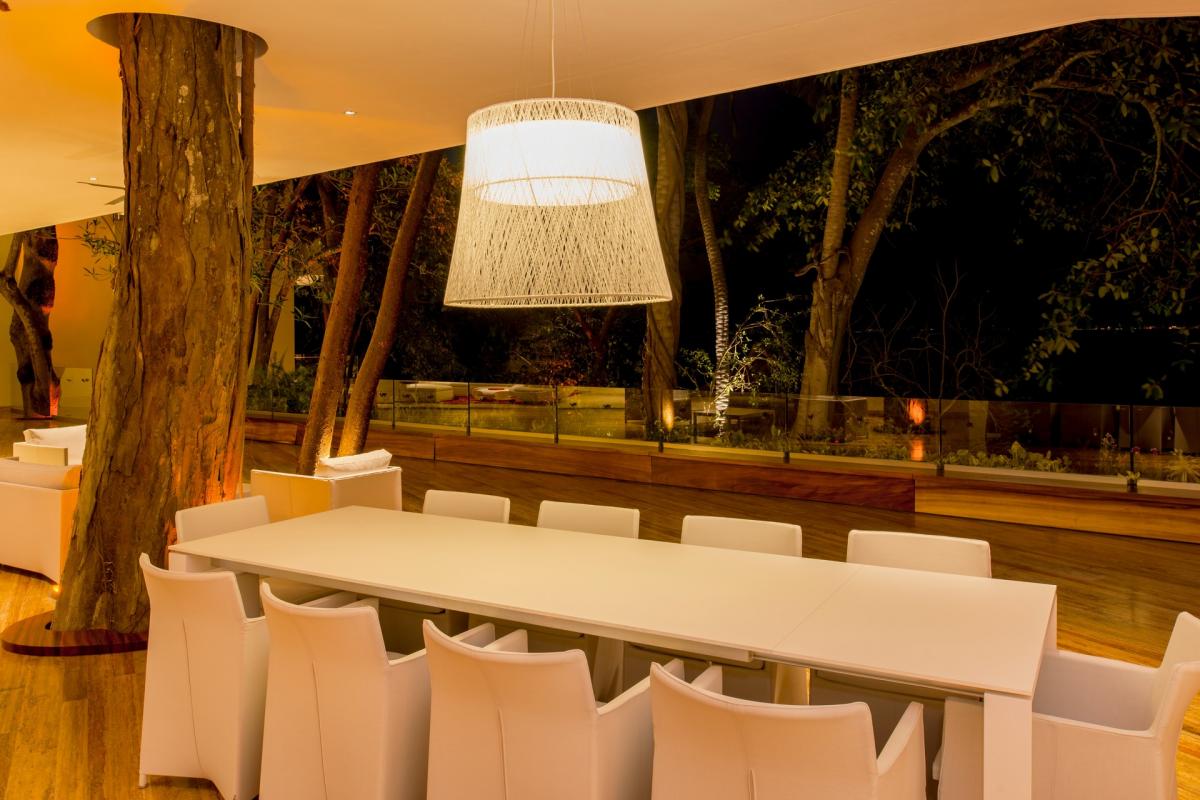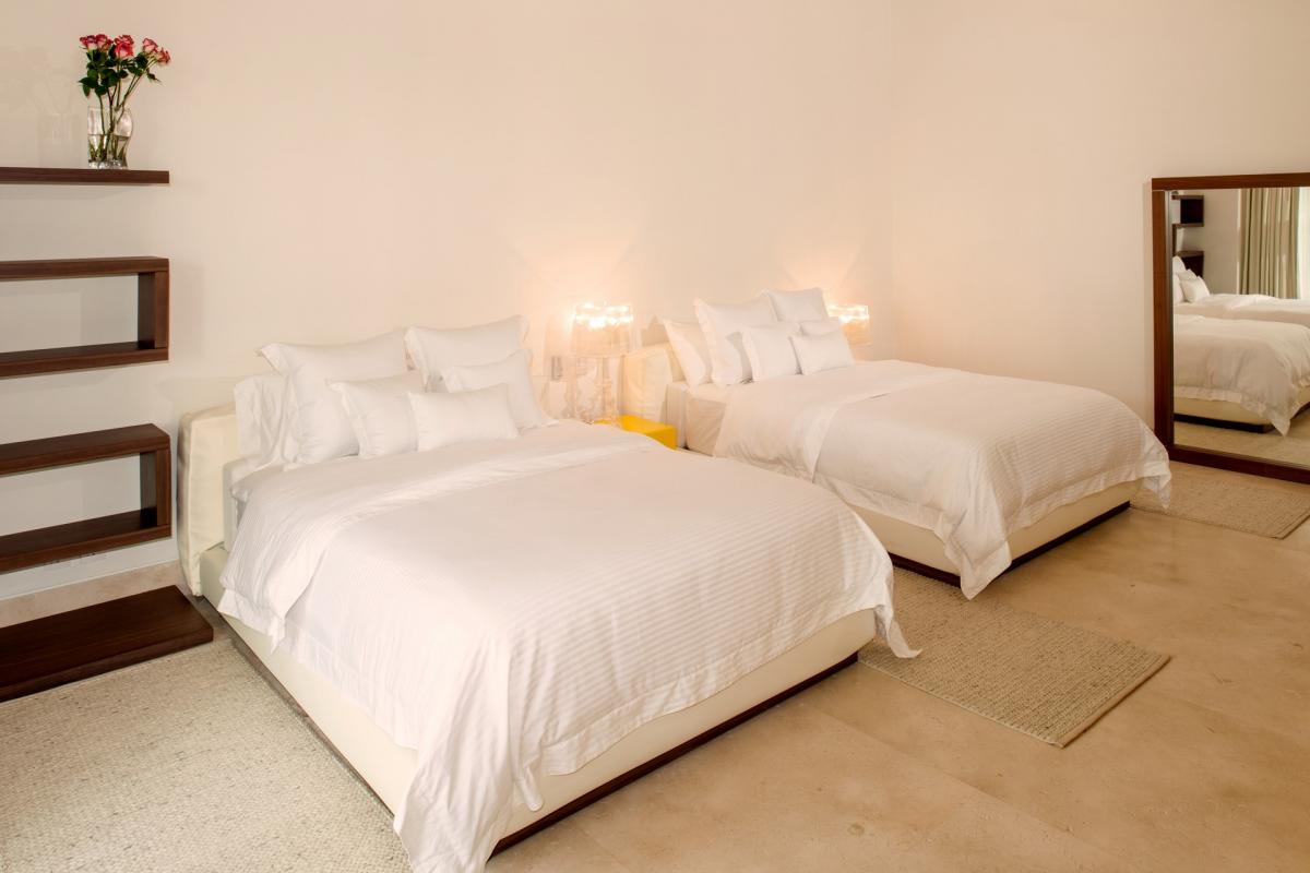 Casa Papelillos is a unique mix of sleek contemporary furnishings and natural features. Trees growing through the oceanfront balconies have been left intact, making the open-plan living areas feel as though they’ve grown out of the landscape. In the living room, clean-lined white seating is cool and modern, while pops of color like a red carpet and yellow cushions add a whimsical touch. A statement stone dining table has room for twelve, and the fully equipped kitchen has a spacious breakfast bar.