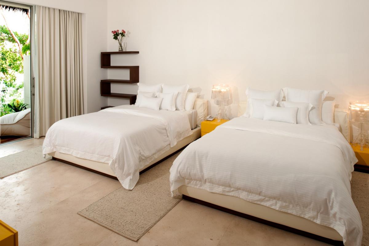 Bedroom 2: Two queen beds, en suite bathroom, in room air, ceiling fans, TV, Bluray DVD player, telephone, interphone, walk-in closet, balcony, ocean and pool view