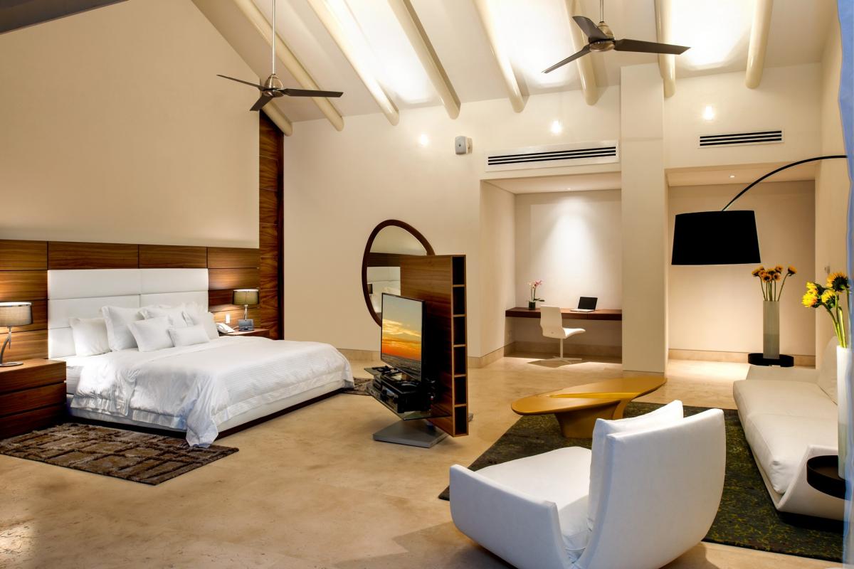Bedroom 4 : King bed, en suite bathroom with bathtub, in room air, ceiling fan, TV, telephone, interphone, walk-in closet, sitting area with coffee table, balcony, ocean and pool view