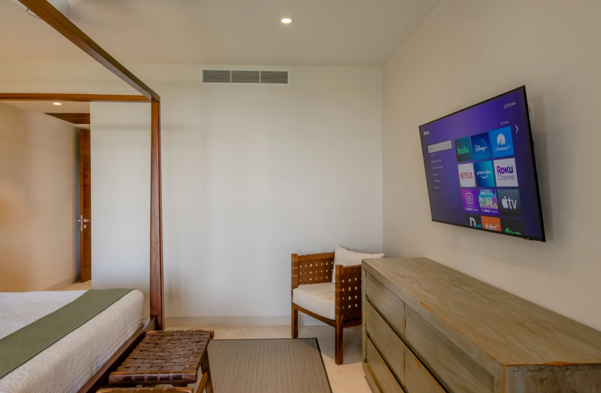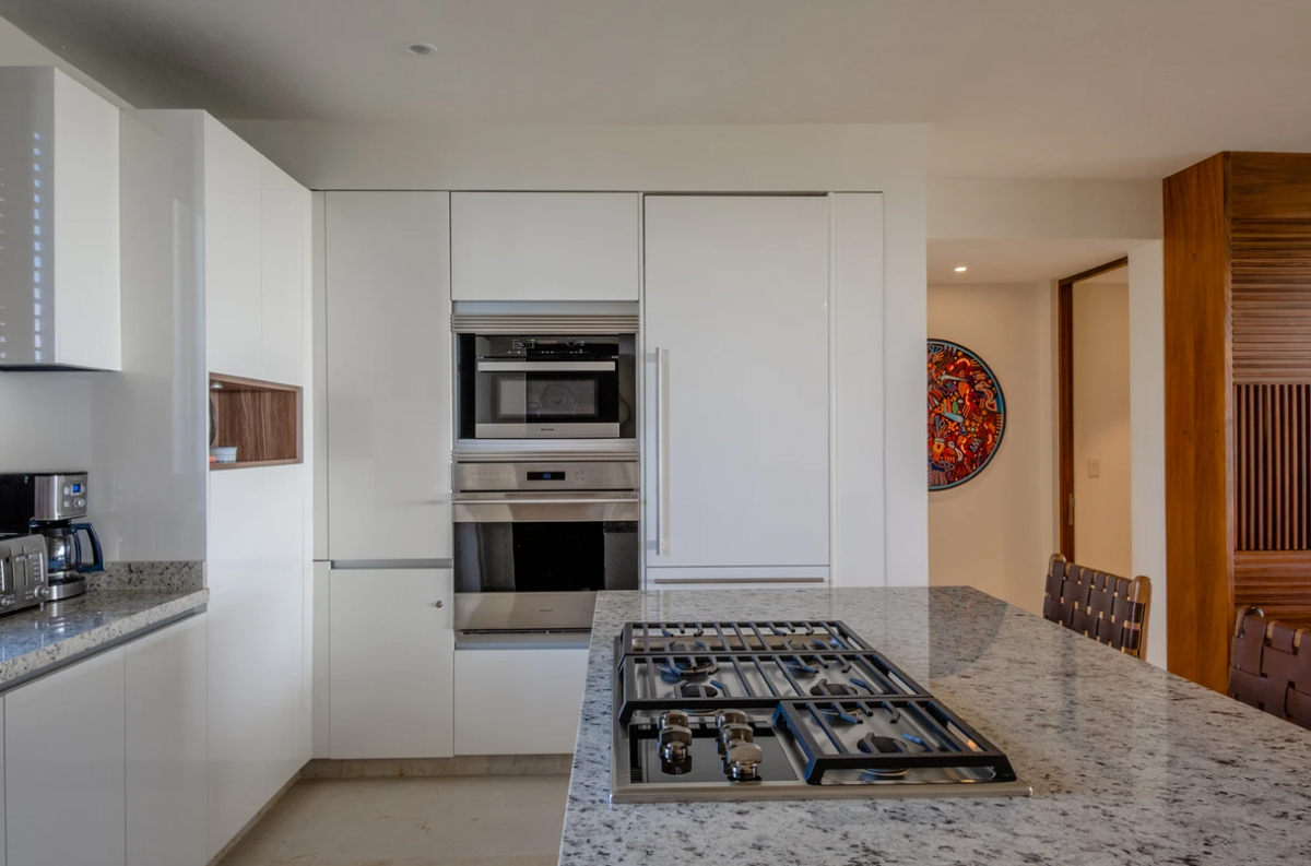A luxurious condominium, Casa Lulu offers 3 bedrooms that can accommodate 8 guests. Located in the Tau development, this exclusive Punta Mita vacation rental is designed with plush, comfortable furniture that is arranged to promote conversation and relaxation, with rich fabrics and sophisticated patterns that add depth and texture. An area rug brings warmth to the seating area, while accent pillows and throws in complementary colors enhance the inviting atmosphere.