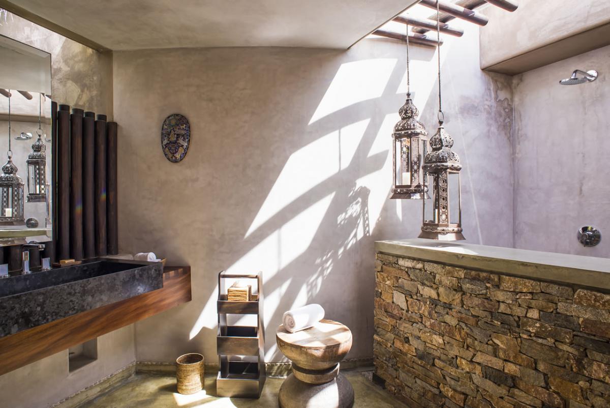 - Bedroom 1: King bed, en suite bathroom with shower and large stone bathtub, alfresco shower, sitting area, terrace