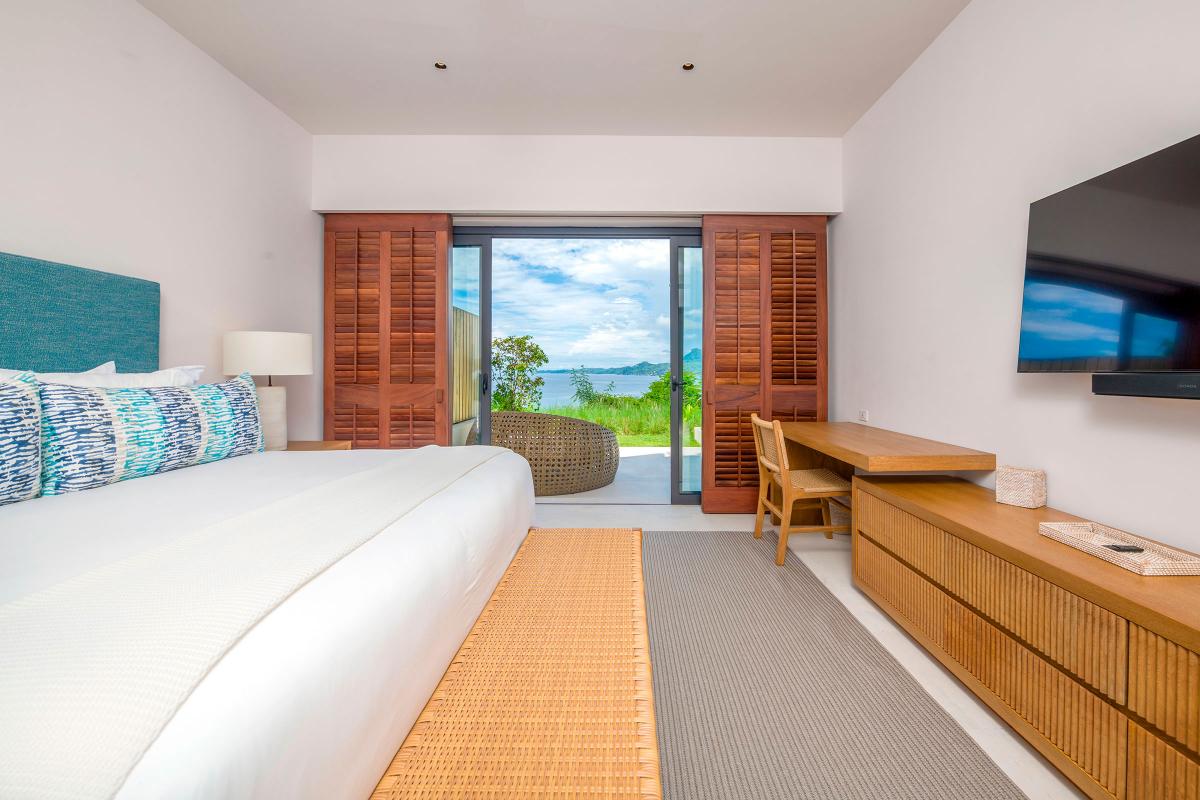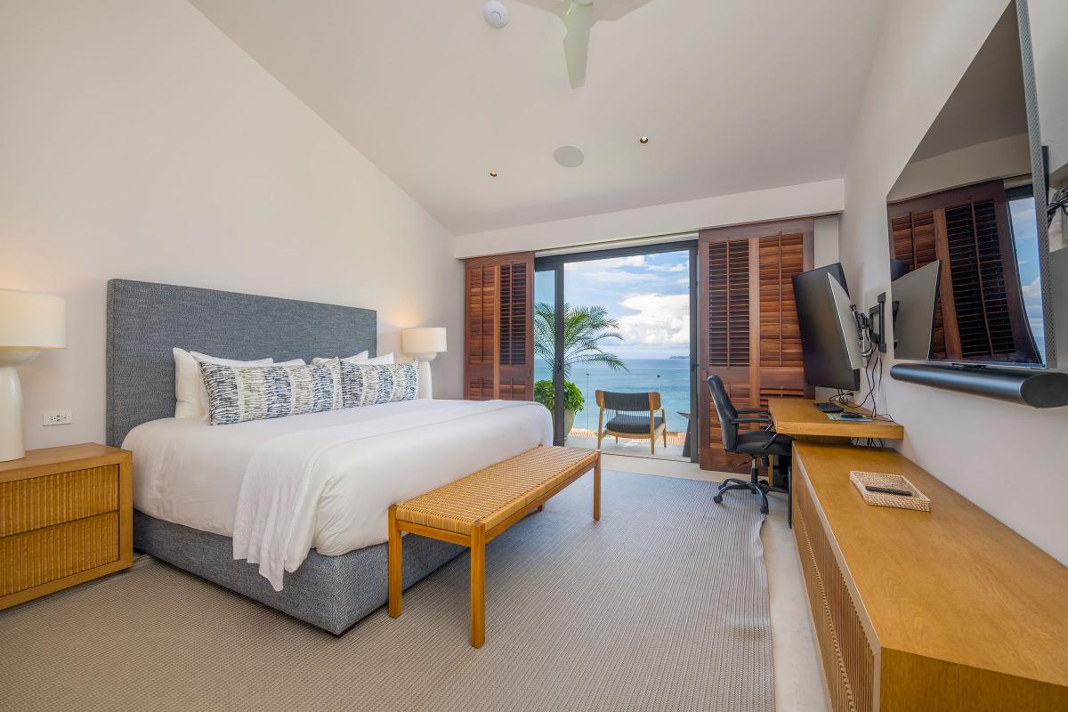 Primary Bedroom: King bed, ensuite bathroom, tv, dedicated work space, access to oceanview patio
