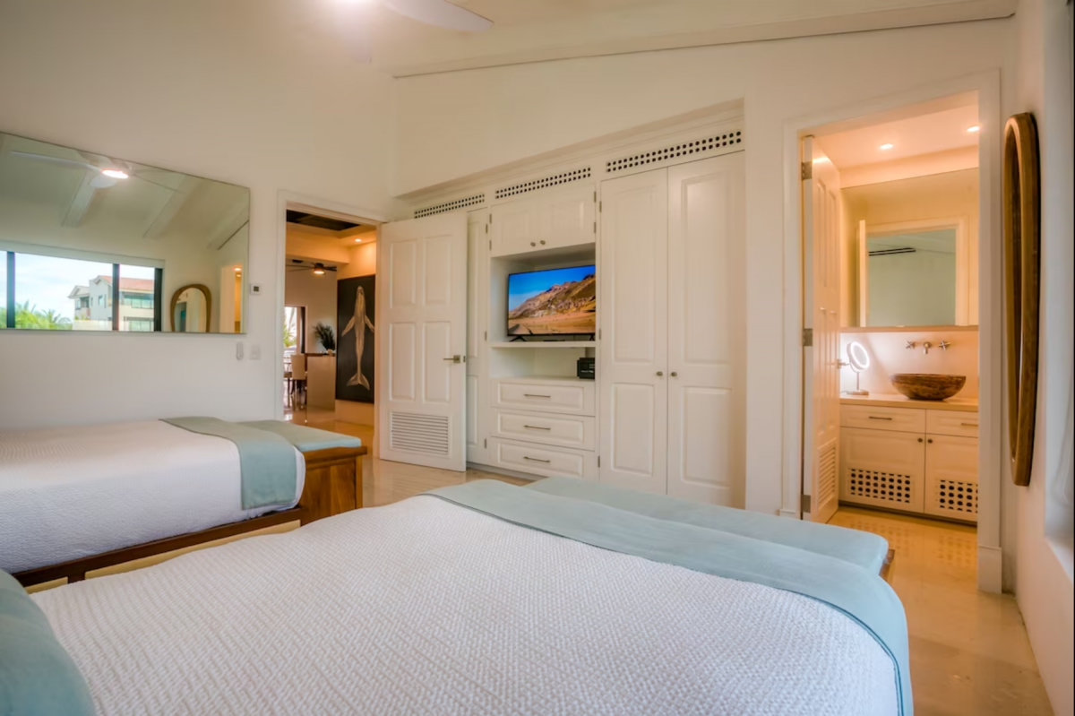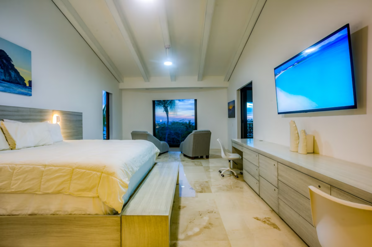 Primary Bedroom: The Primary Bedroom is equipped with a king-sized bed, a TV, air conditioning, and an ensuite bathroom.