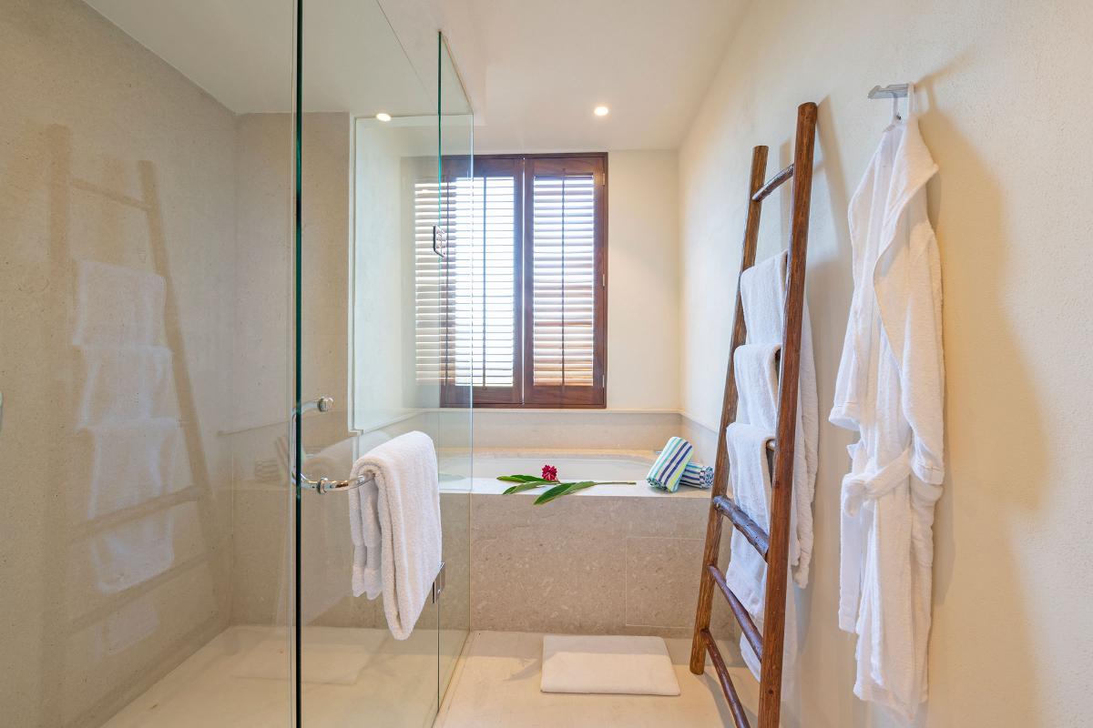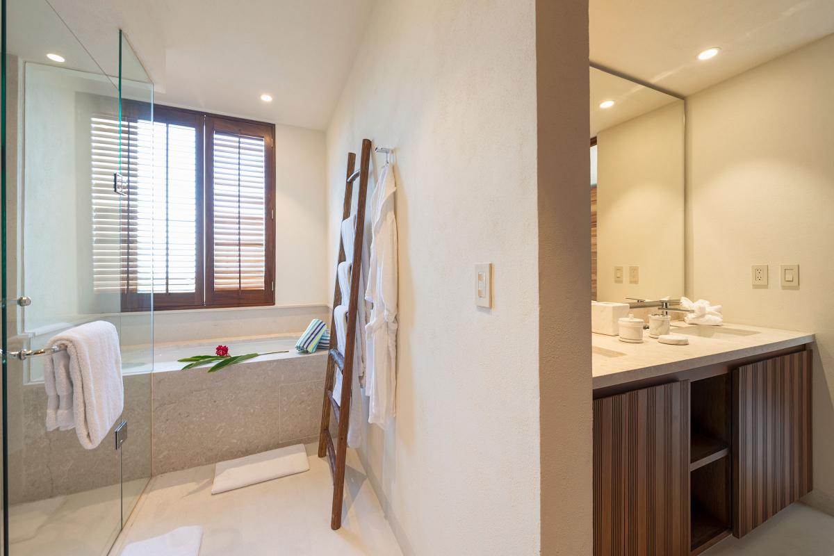 Condo Carey is a three-bedroom and 3.5 bathroom condo. This private residence is sophisticated with two master bedrooms facing the ocean with ensuite bathrooms, plus a single outdoor shower; it also has an expansive private terrace with a plunge pool and a separate living and dining room.