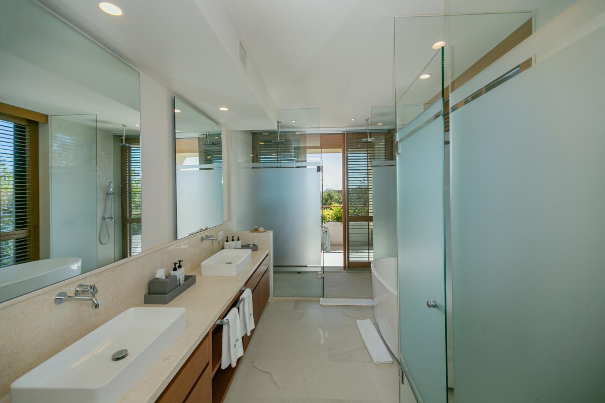 Primary Bedroom: King bed, bathroom with double rain shower and tub, walk-in closet, safe, smart TV, AC, terrace area