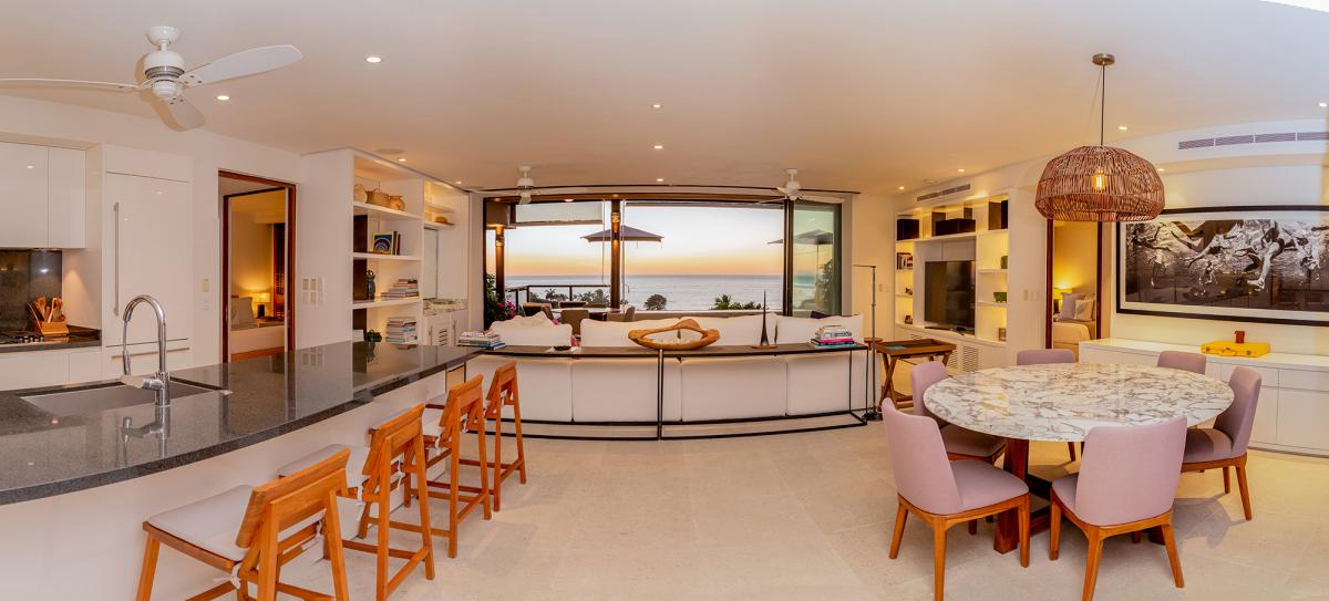 Condo El Morro is a gorgeous three-bedroom and three-bath Punta Mita vacation rental. This incredible Punta Mita condo is located in Las Marietas in Punta Mita. Two of the bedroom suites contain a king-sized bed and an ensuite bathroom, and the third bedroom suite includes two sets of bunk beds and an ensuite bathroom. In addition, Condo El Morro offers guests housekeeping services, cooking services, and concierge services. A golf cart, a terrace plunge pool, a fully equipped kitchen, a satellite TV, and welcome toiletries are amenities for guests to enjoy when staying at Condo El Morro. Guests also receive a Premier Golf Membership, including access to the Pacifico Beach Club and the Kupuri Beach Club. Guest may also access the PAcific & Bahia Golf Courses, Tennis Center, and Fitness Center with additional fees.