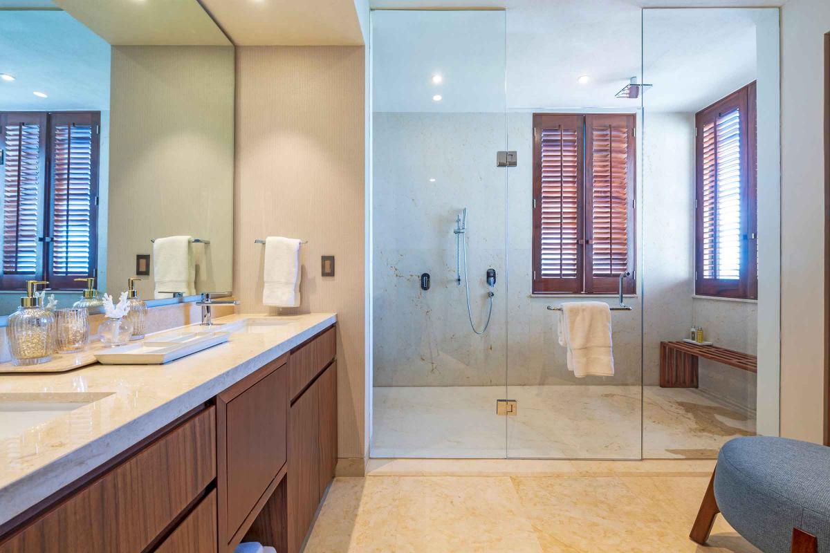Primary Bedroom: The Primary Bedroom is equipped with a king-sized bed, a TV, a ceiling fan, air conditioning, a private patio with an ocean view, and an ensuite bathroom with a double shower.