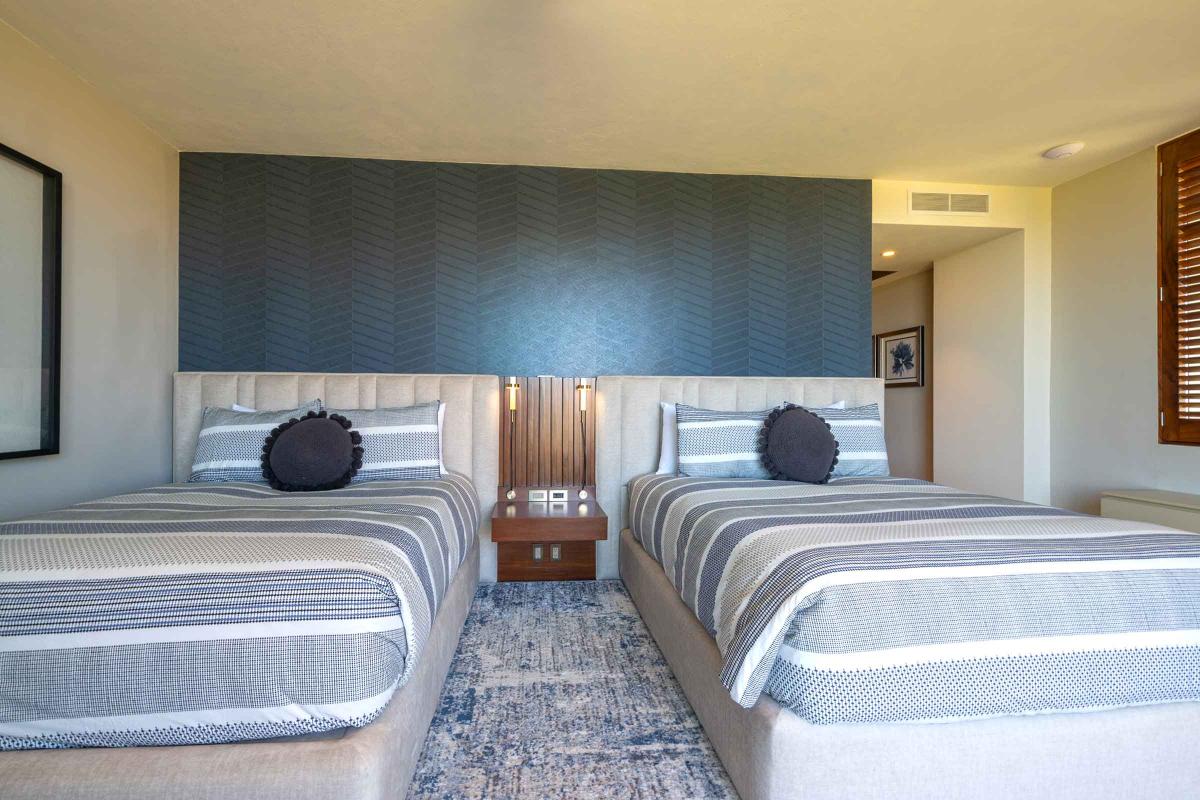 Bedroom 2: Bedroom 2 is equipped with two queen-sized beds, a TV, a ceiling fan, air conditioning, access to a private patio, and an ensuite bathroom with a shower and tub.