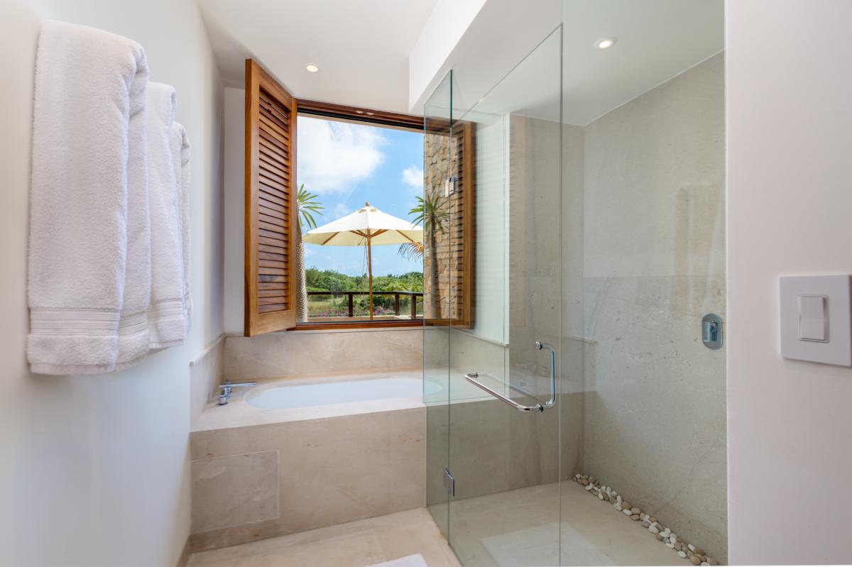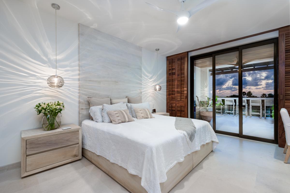 Primary Bedroom: King-sized bed with an ensuite bathroom equipped with an indoor and outdoor shower.