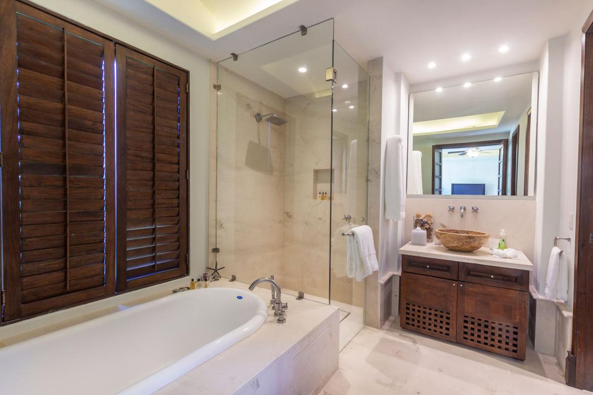 Primary Bedroom 1: This bedroom has a king-sized bed, a jacuzzi, ceiling fan, air-conditioning, flat screen, a DVD player, a safe, and an ensuite bathroom.