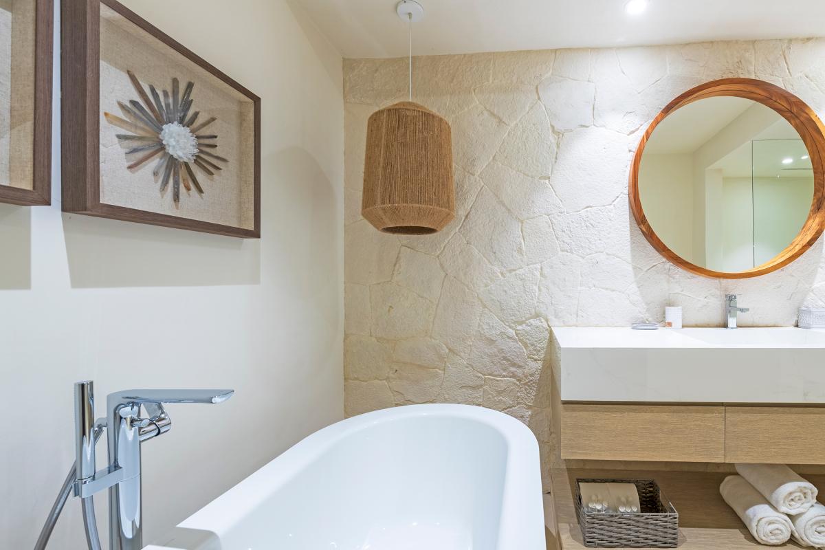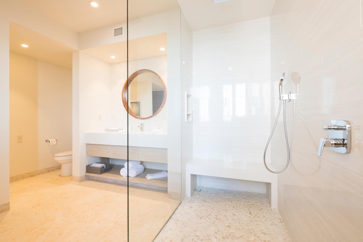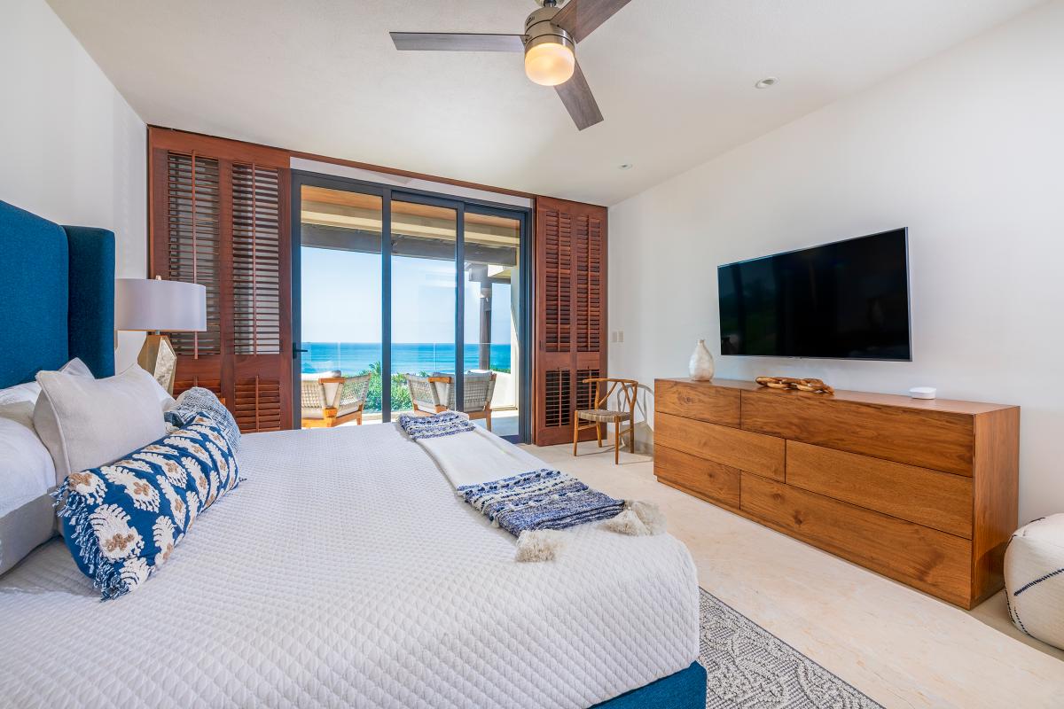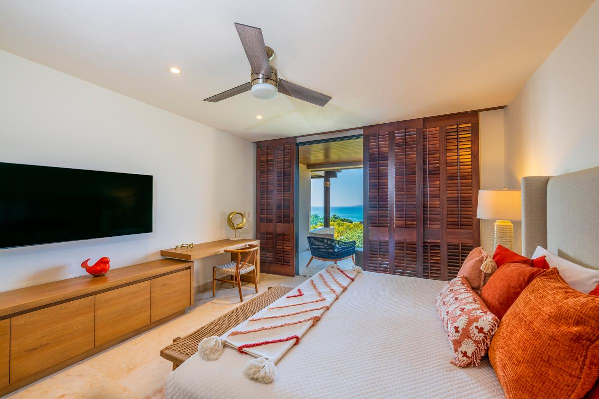 Primary Bedroom: The Primary Bedroom is equipped with a king-sized bed, a TV, access to a shared patio with spectacular views, a ceiling fan, air conditioning, and a private furnished patio with an ocean view. There is also an ensuite bathroom with a bathtub and shower.