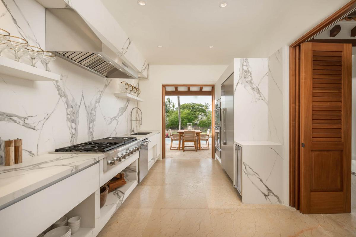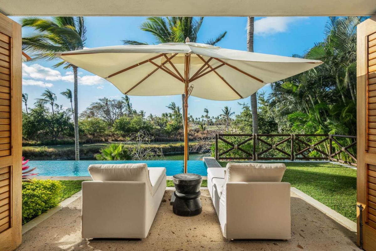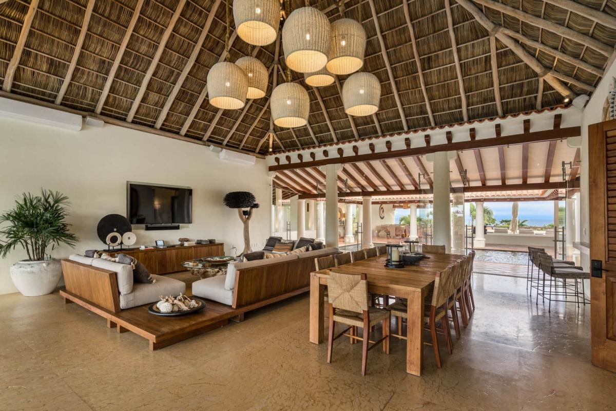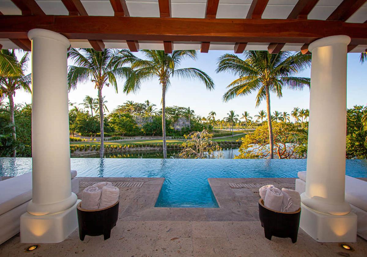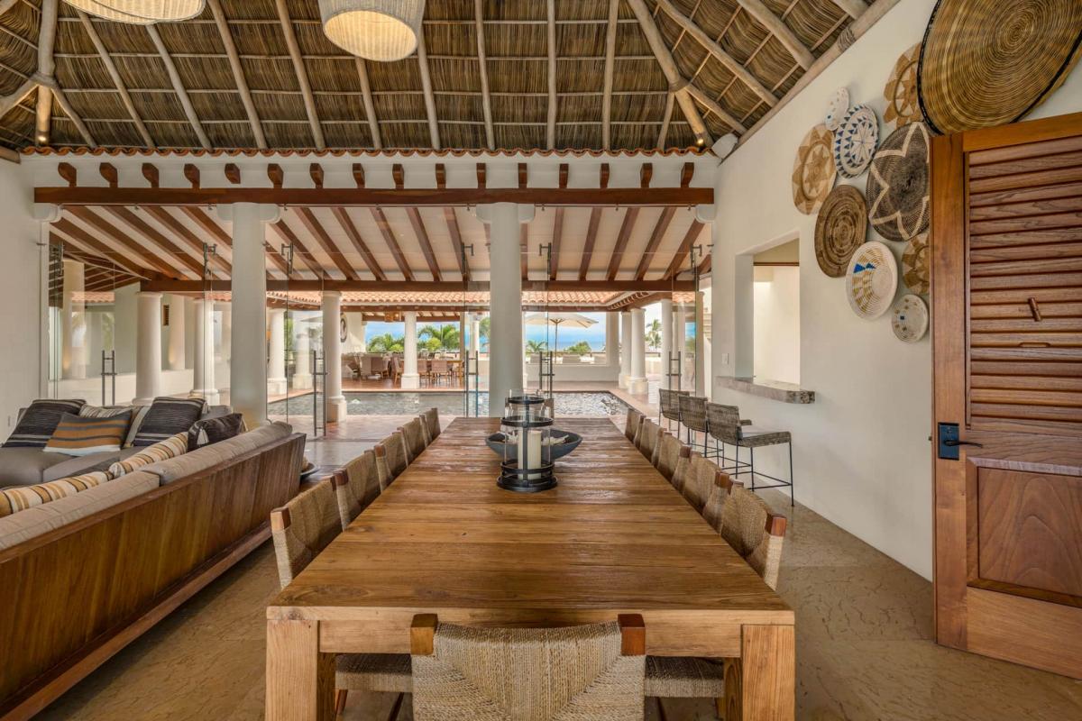A spacious 10,000 sq ft villa featuring an expansive open floor plan across two stories. The villa encompasses five generous bedroom suites, each with private bathrooms equipped with both indoor and outdoor showers. A fully equipped chef's kitchen and a dining area accommodating up to 12 guests enhance the experience, complemented by two additional separate dining areas for a more intimate culinary setting. Positioned in a distinctive manner, the villa offers sweeping views of both the ocean in the front and the golf course in the rear. It boasts a 60-foot heated pool that overlooks the 13th hole of the Pacifico golf course.